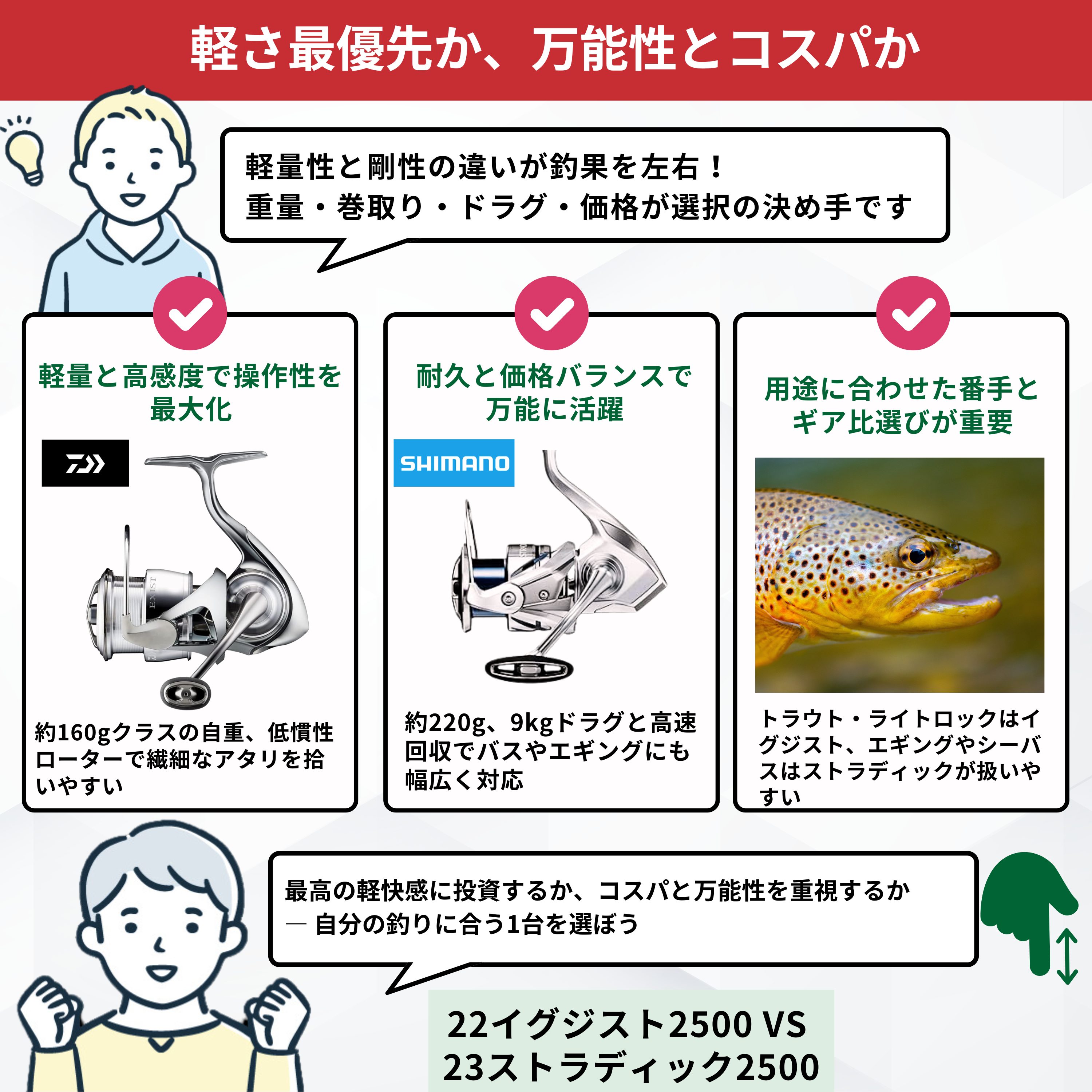おおまかに言えば「最高の軽快感に投資」か「万能に強い完成度を安く得るか」です。軽量ロッドとのマッチングや釣行頻度も考え、軽さに価値を置くならイグジスト、守備範囲と予算重視ならストラディックを選びましょう。
