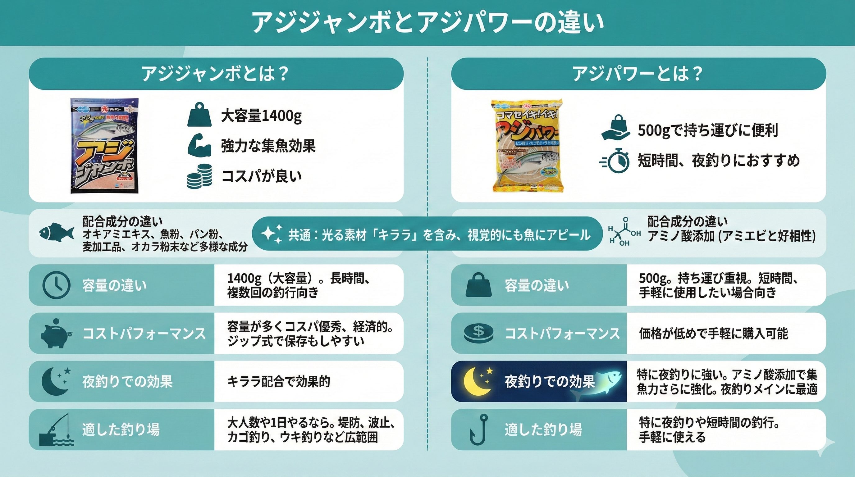 両者ともにキララを含んでいるため、夜釣りに効果的です。しかし、アジパワーは特に夜釣りを意識して作られており、アミノ酸添加により集魚力がさらに強化されています。そのため、夜釣りをメインにする場合は、アジパワーがより適しています。