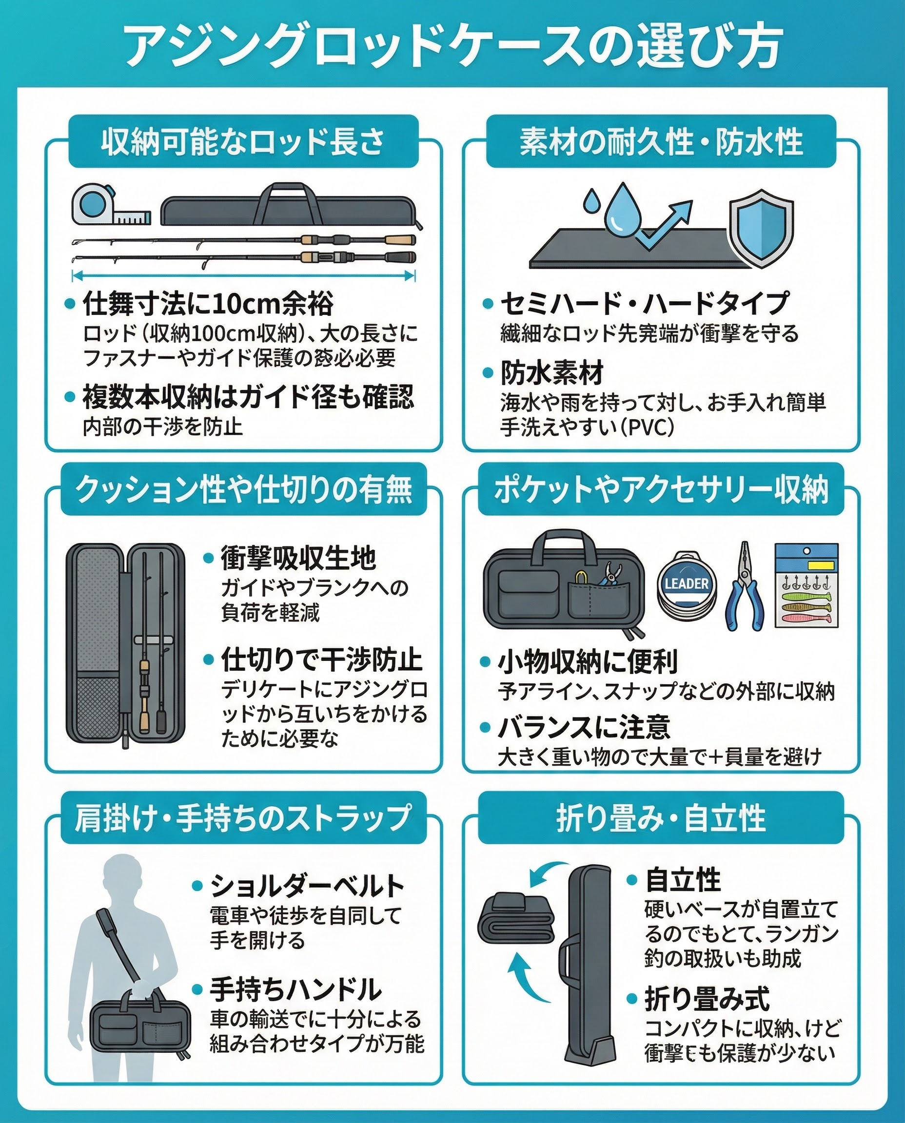 アジングロッドはティップが細いため、外部からの衝撃をカバーしてくれるセミハードやハードタイプが人気です。海水や雨による濡れも考慮し、防水性能がある素材や塩ガミを起こしにくいファスナー採用のケースを選べば、長期的に安心して使えるでしょう。