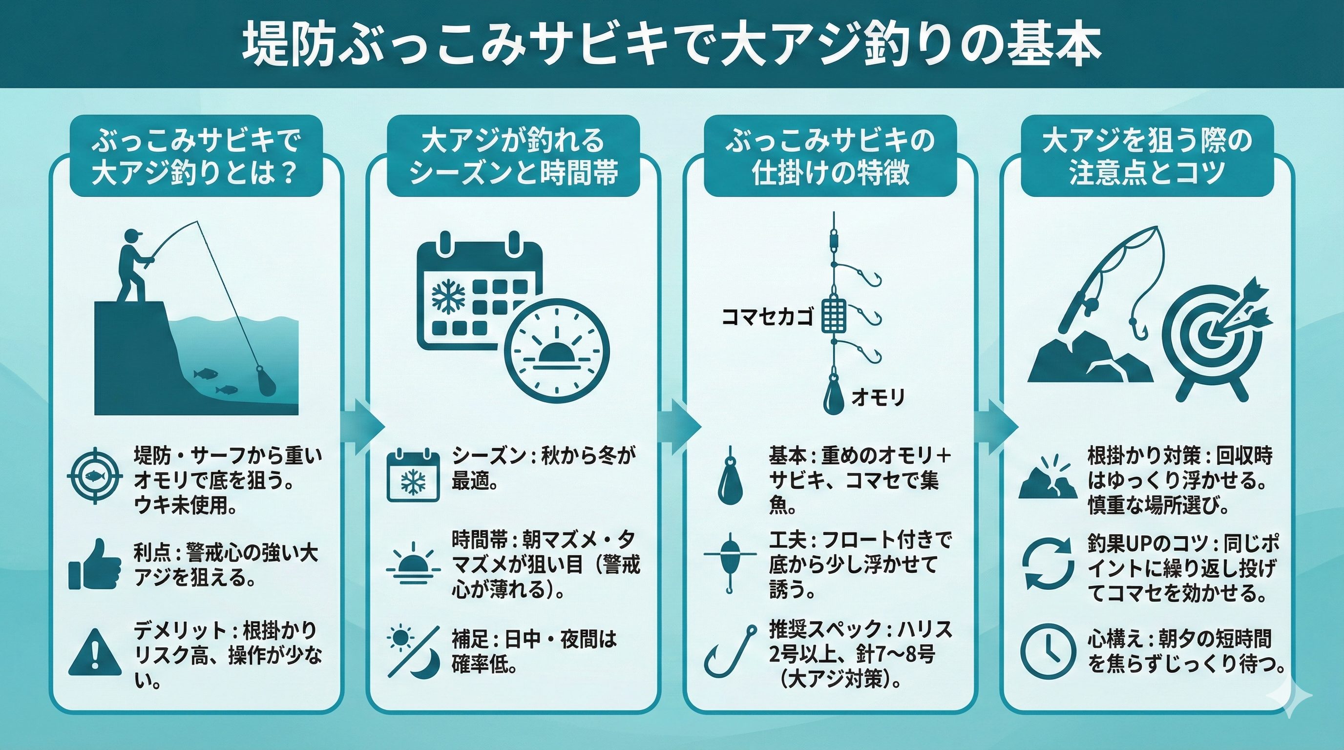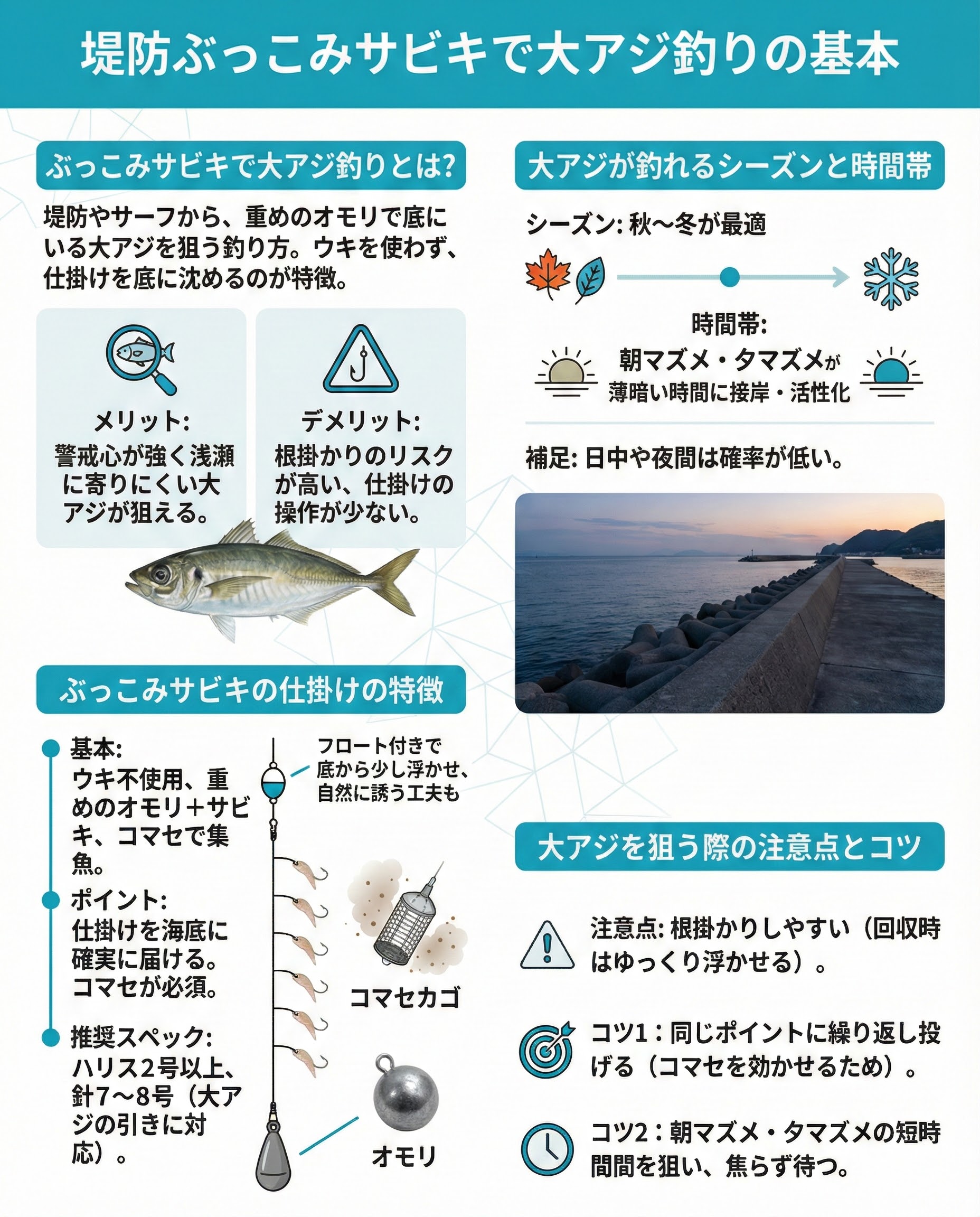 ぶっこみサビキで大アジ釣りとは、堤防やサーフから大アジを狙う釣り方の一つです。