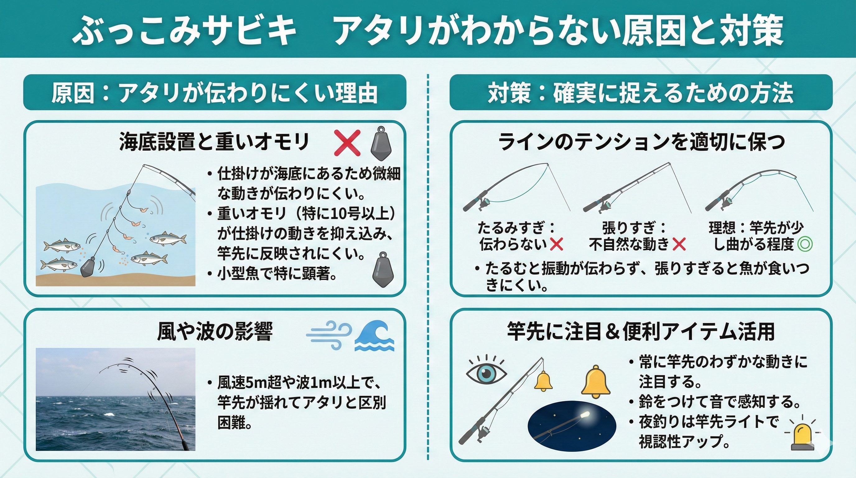 • ぶっこみサビキでアタリがわからない主な原因は、海底設置の仕掛けや重いオモリの使用です。