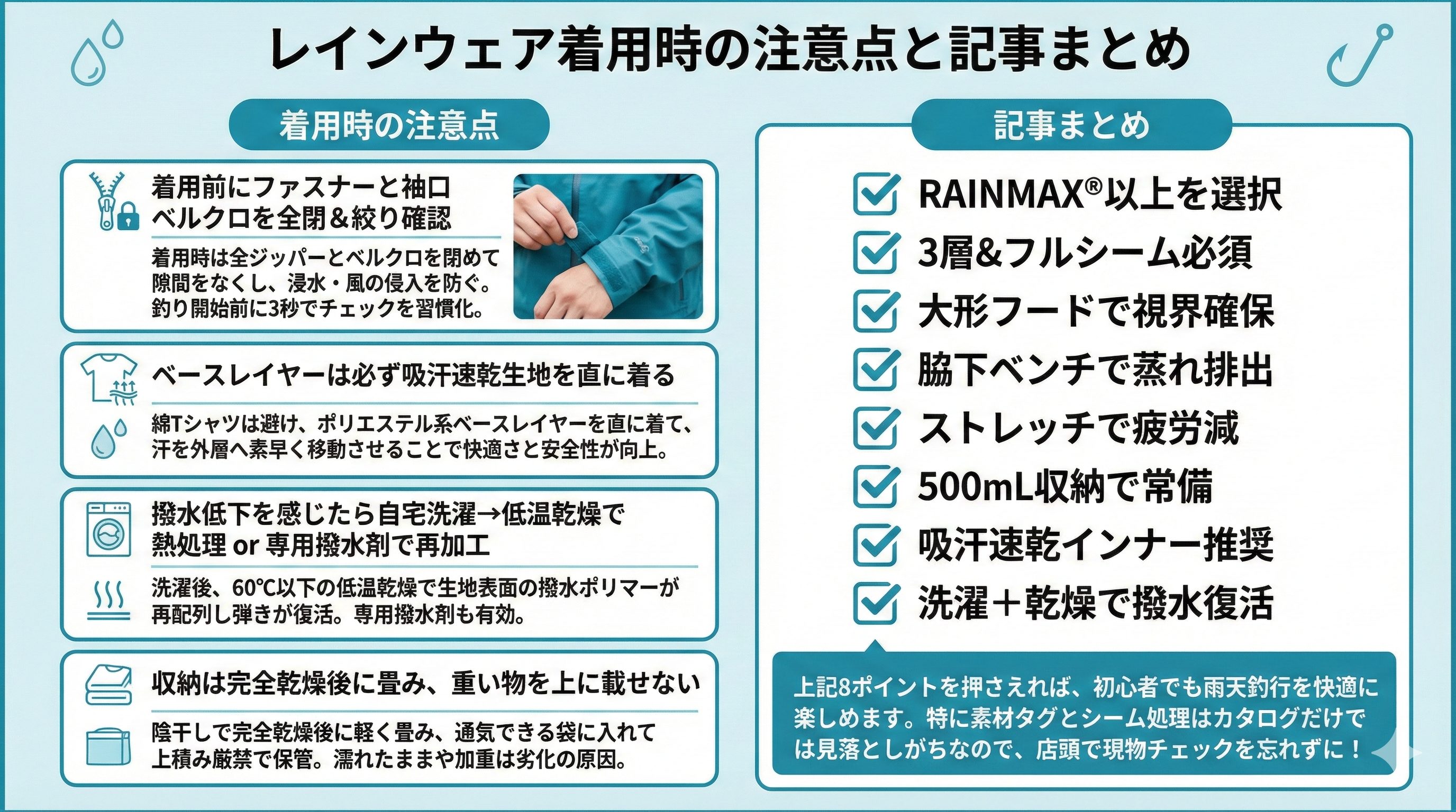 上記8ポイントを押さえれば、初心者でも雨天釣行を快適に楽しめます。特に素材タグとシーム処理はカタログだけでは見落としがちなので、店頭で現物チェックを忘れずに!