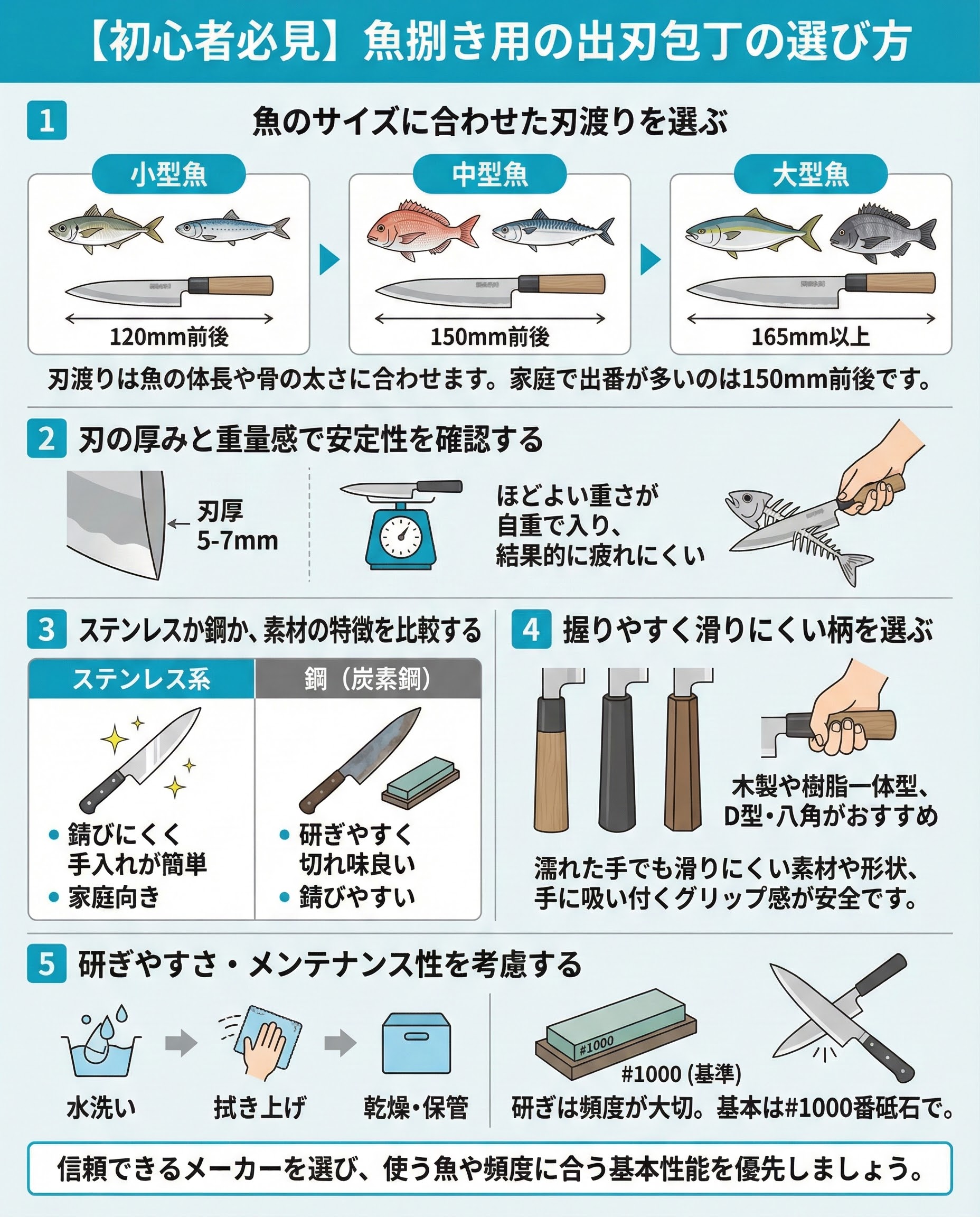 刃渡りは魚の体長や骨の太さに合わせます。アジ・イワシなど小型は120mm前後、タイ・サバなど中型は150mm前後、ブリやクロダイなど大型は165mm以上だと扱いやすいです。