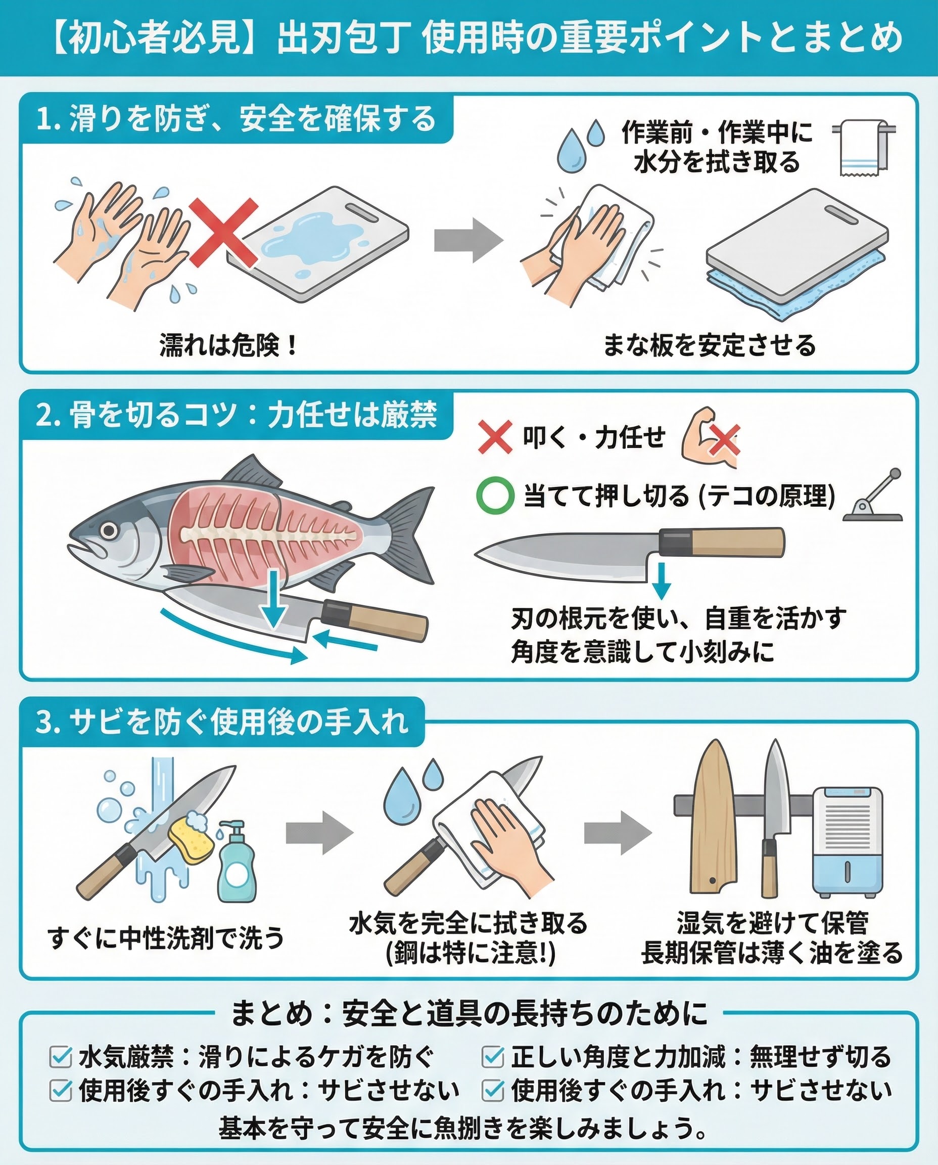 芯まで研げる構造を選び、無理に骨を叩かず、使用後はすぐ洗って拭く。