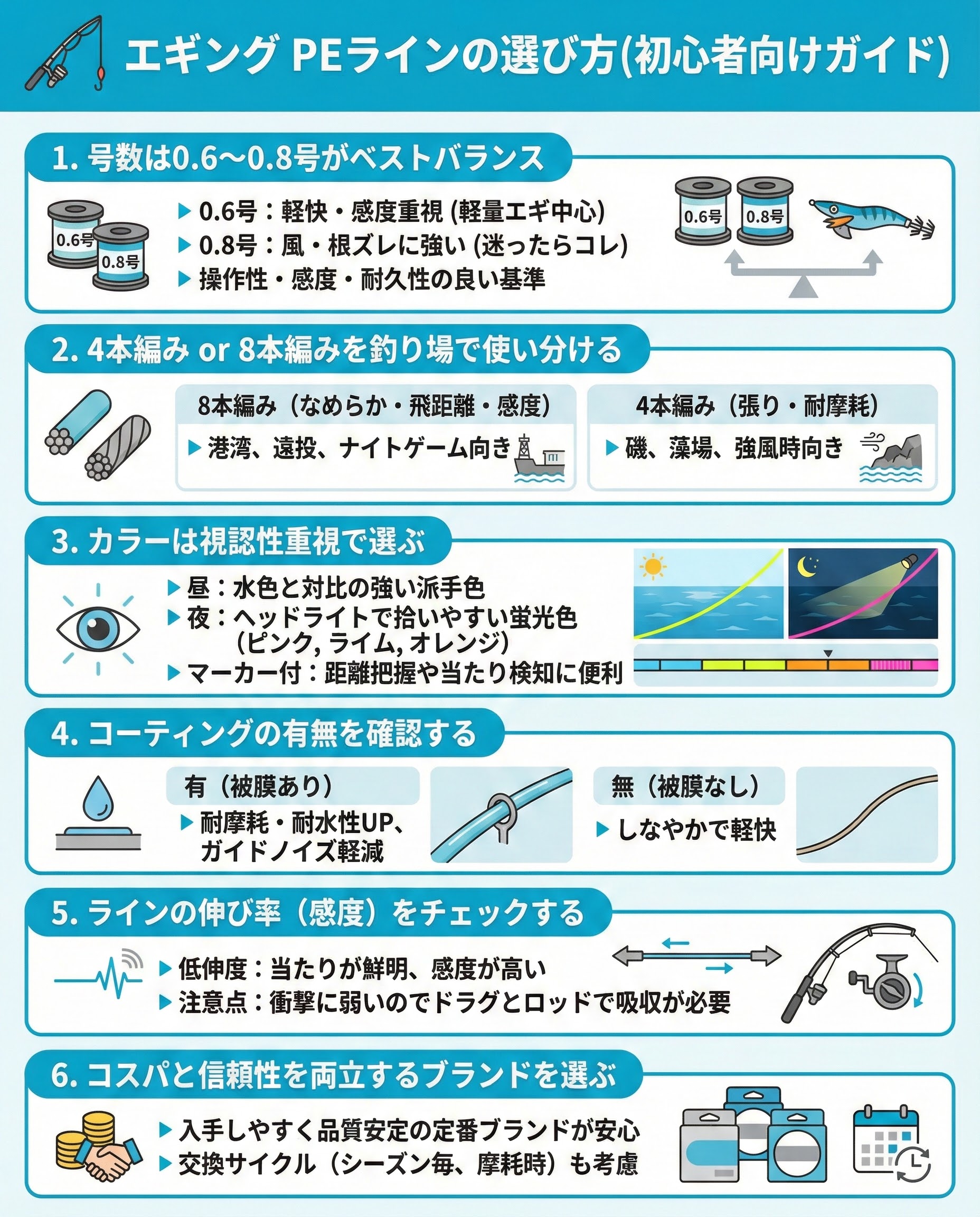 エギングのPEは「適正号数」「場所別の編み数」「見える色」「被膜の好み」「伸度」「信頼ブランド」の6要素で決めれば迷いません。手入れと早めの交換で、超感度セッティングを長く保ちましょう。