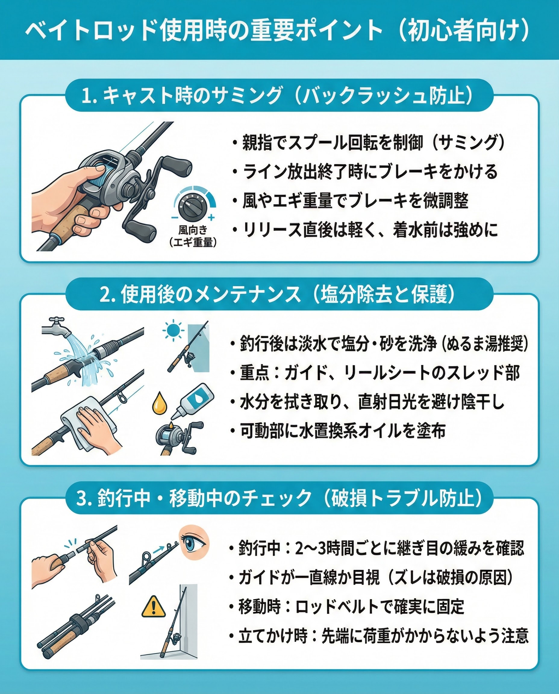 まずは基準どおりの1本を選び、現場で微調整。季節・場所・風を踏まえて長さや硬さを使い分ければ、ベイトエギングは一気に快適になります。必要に応じて携行性や汎用性も考慮し、あなたのホームに最適化しましょう。