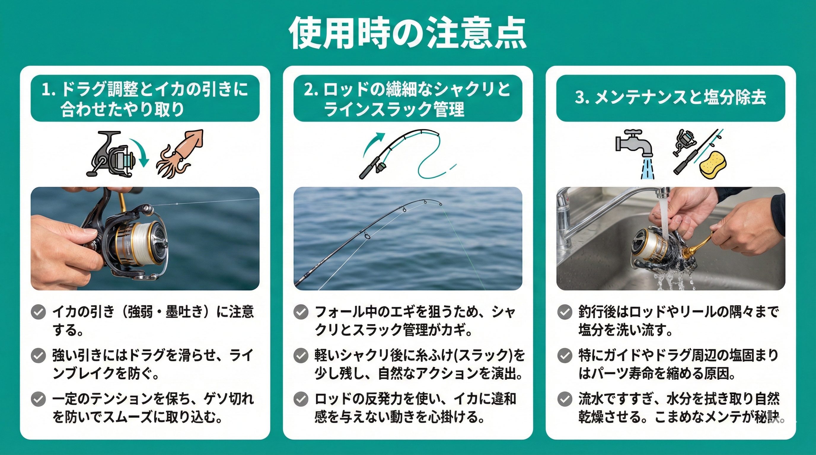 ドラグ調整とイカの引きに合わせたやり取り