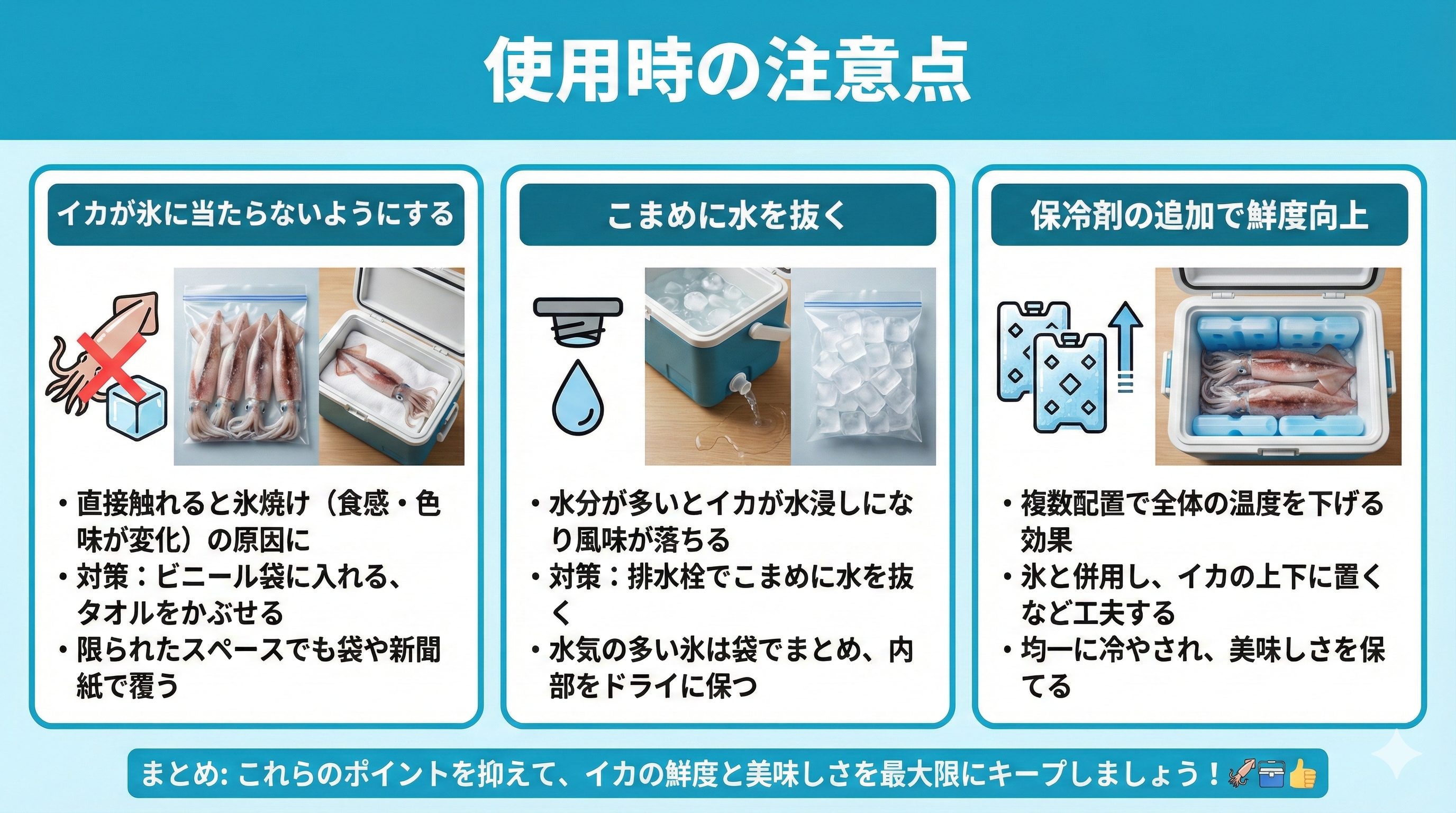 イカは温度変化に敏感なので、氷は十分に用意しておくと安心です。ただし直接触れないようにジップロックなどで対策しましょう。