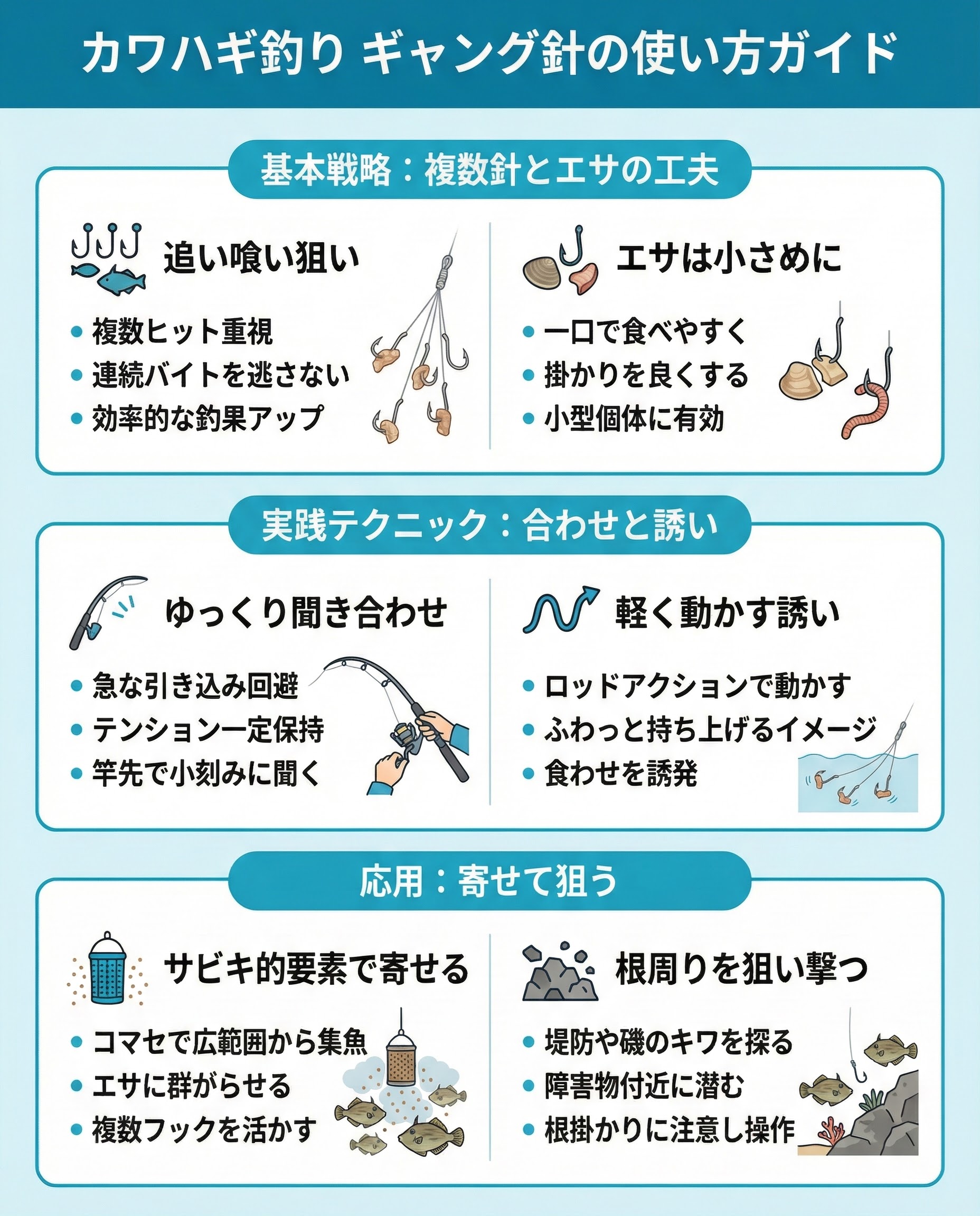 カゴを使って寄せエサを撒き、サビキ釣りのように魚を寄せるアプローチもギャング針との相性が良好です。エサに群がるカワハギが多いほど、複数フックを搭載したギャング針を生かしやすくなります。周辺に散らばった個体を広範囲から集められる点がメリットです。