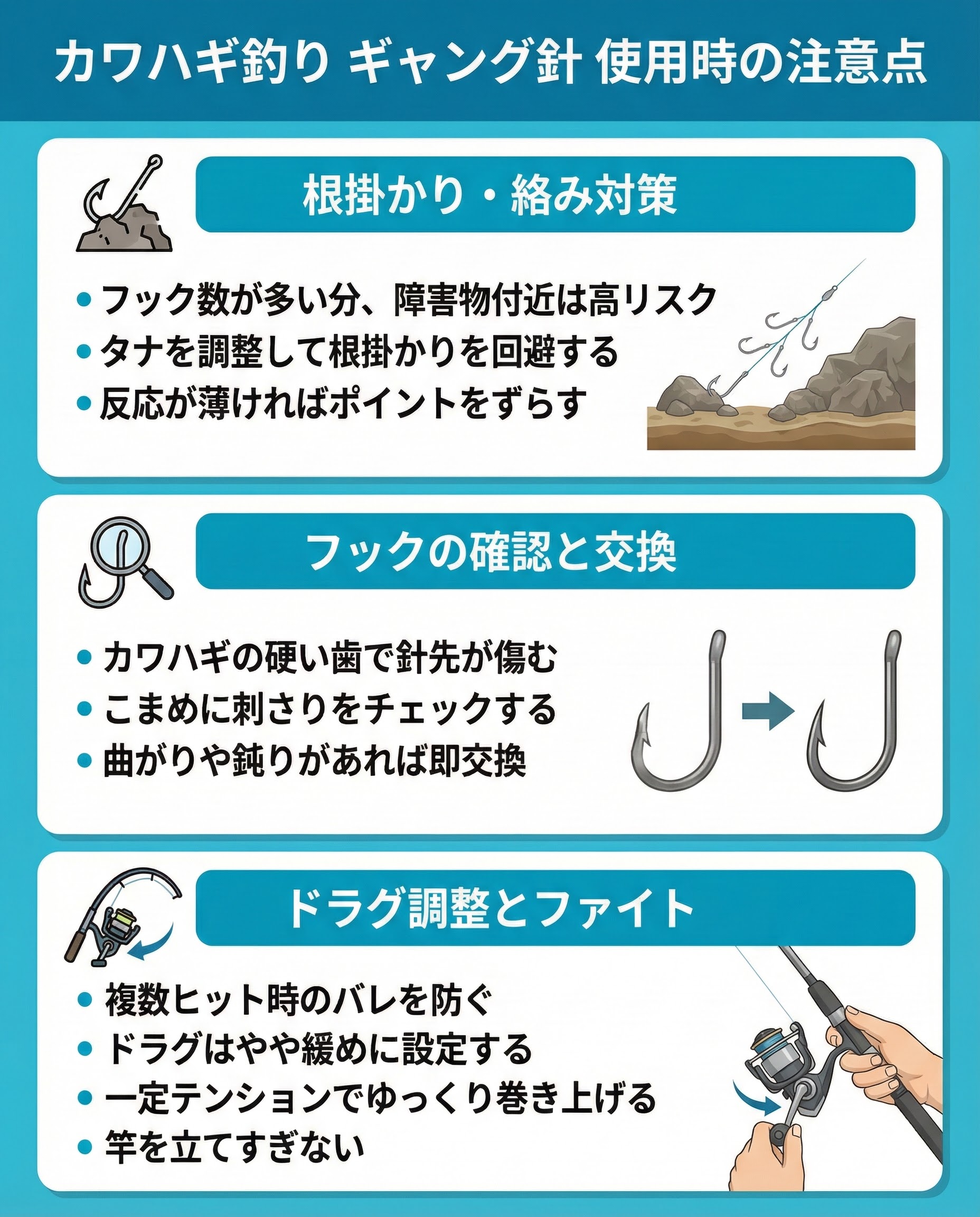 カワハギ釣りのギャング針は、多点掛けを狙えるため初心者からベテランまで注目度が高い仕掛けです。正しい使い方と定期的なメンテナンスを意識して、安全かつ効率的にカワハギをキャッチしていきましょう。