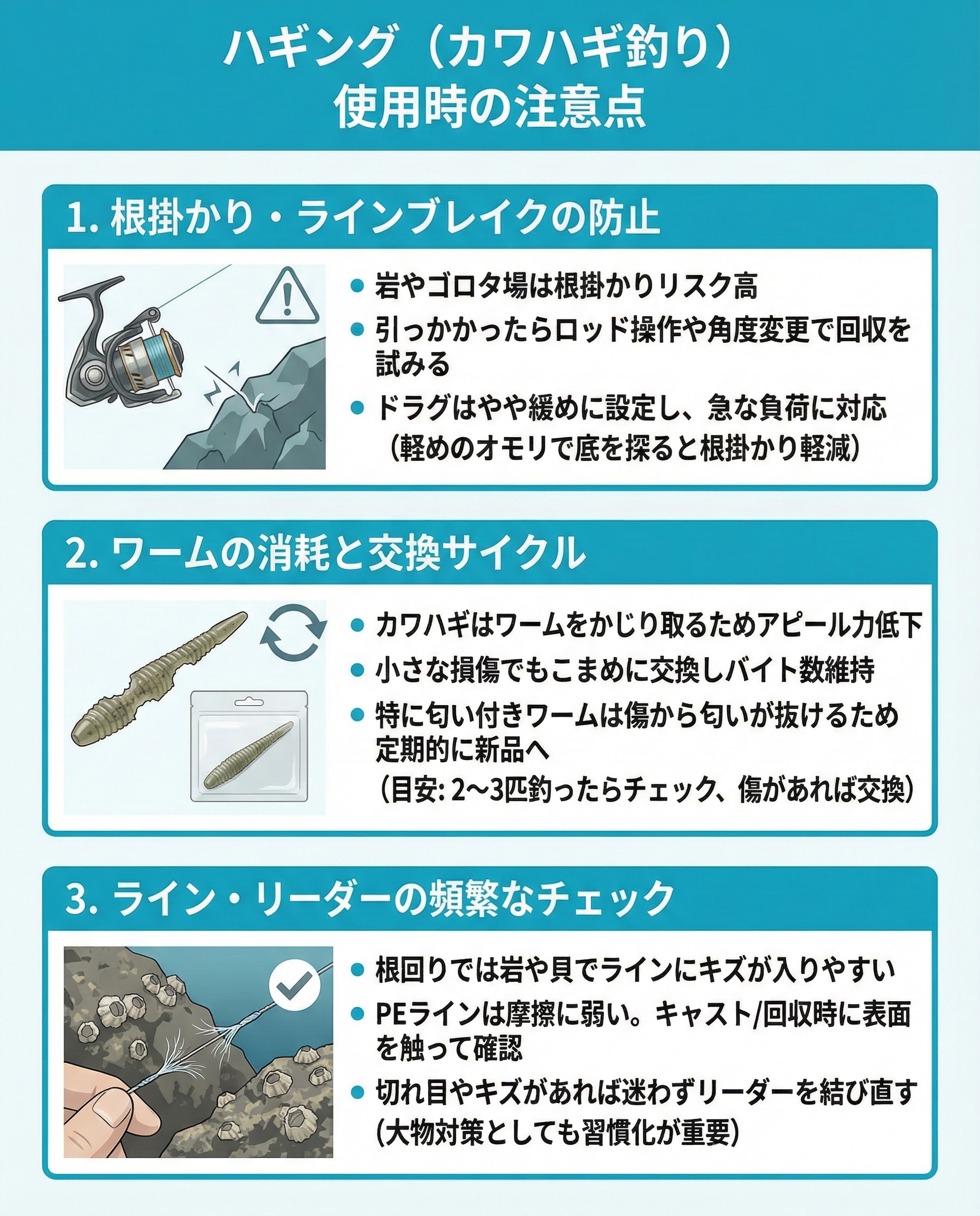 根回りを狙うハギングでは、ラインやリーダーが岩や貝に擦れてキズが入りやすいです。PEラインは摩擦に弱いので、キャストや回収時に表面を軽く触って確認しましょう。切れ目がありそうなら迷わずリーダーを結び直し、ラインブレイクを防ぐ工夫が必要です。