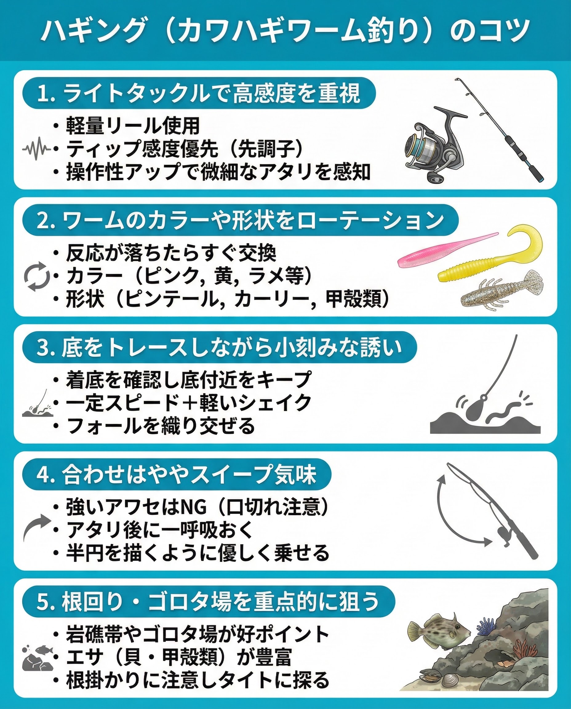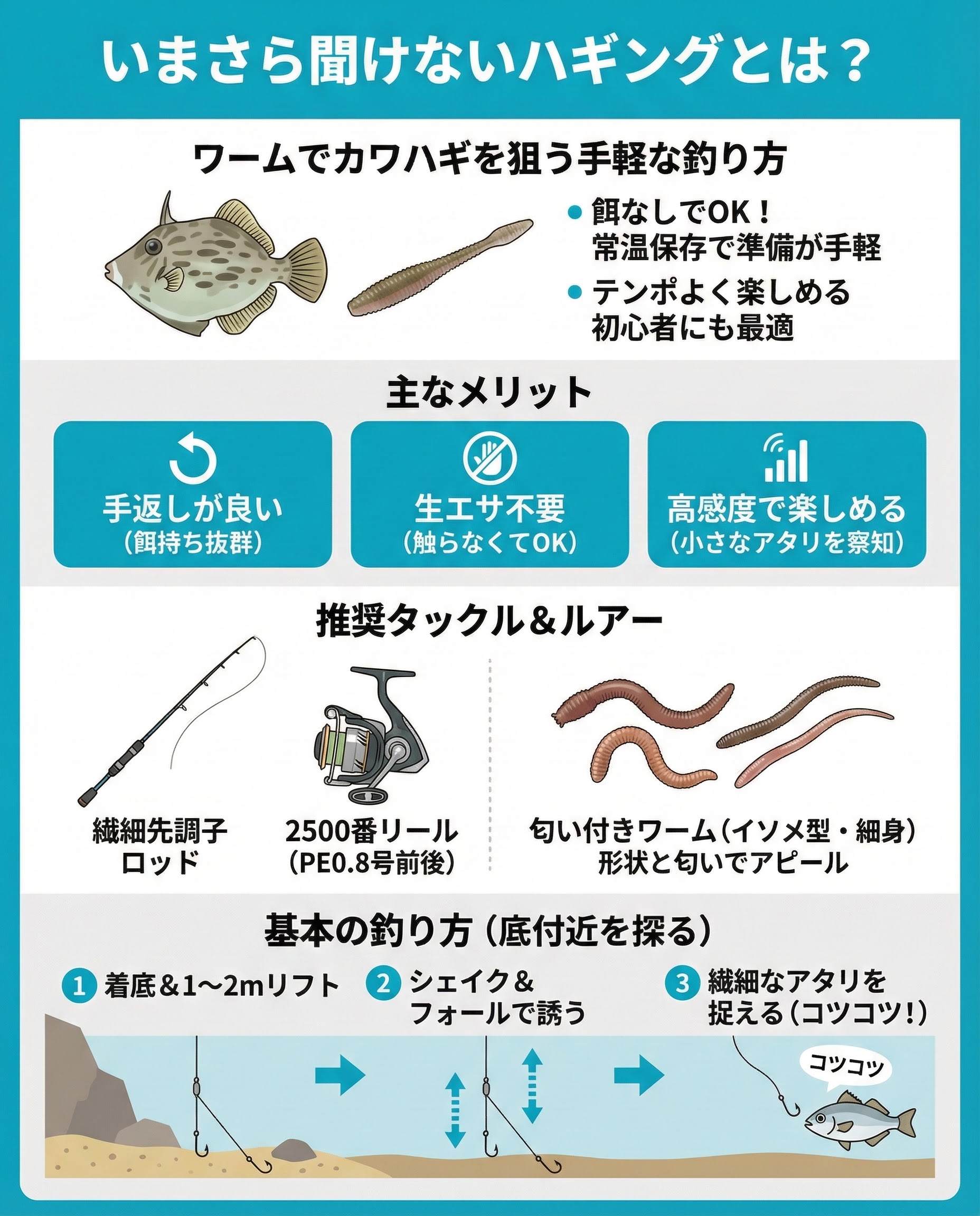 ハギングは、ワームを使ってカワハギを狙う手軽な釣り方です。専用のエサを準備しなくてもOKで、感度の高いタックルを使えば小さなアタリも見逃しません。ここでは、いまさら聞けないハギングの基本とコツ、そしておすすめワームや使用時の注意点をまとめました。
