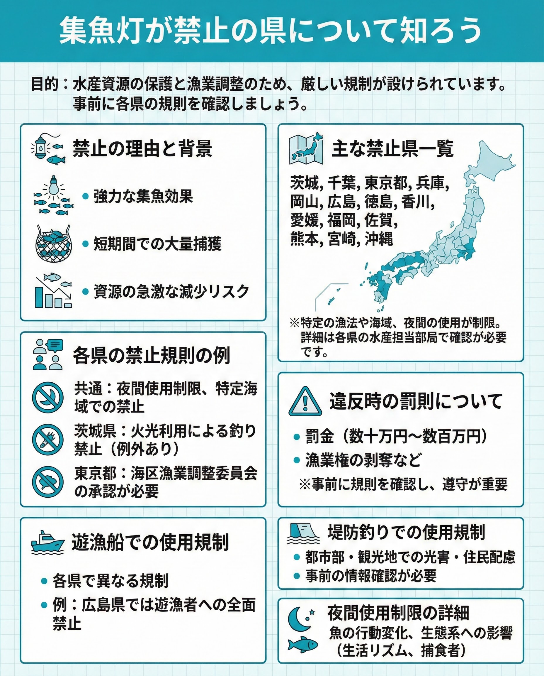 集魚灯の使用が禁止されている県では、水産資源の保護や漁業の調整を目的として、厳しい規制が設けられています。釣りを楽しむ際には、事前に各県の規則を確認し、適切な対応が求められます。ここでは、集魚灯が禁止されている主な県とその理由について詳しく見ていきましょう。