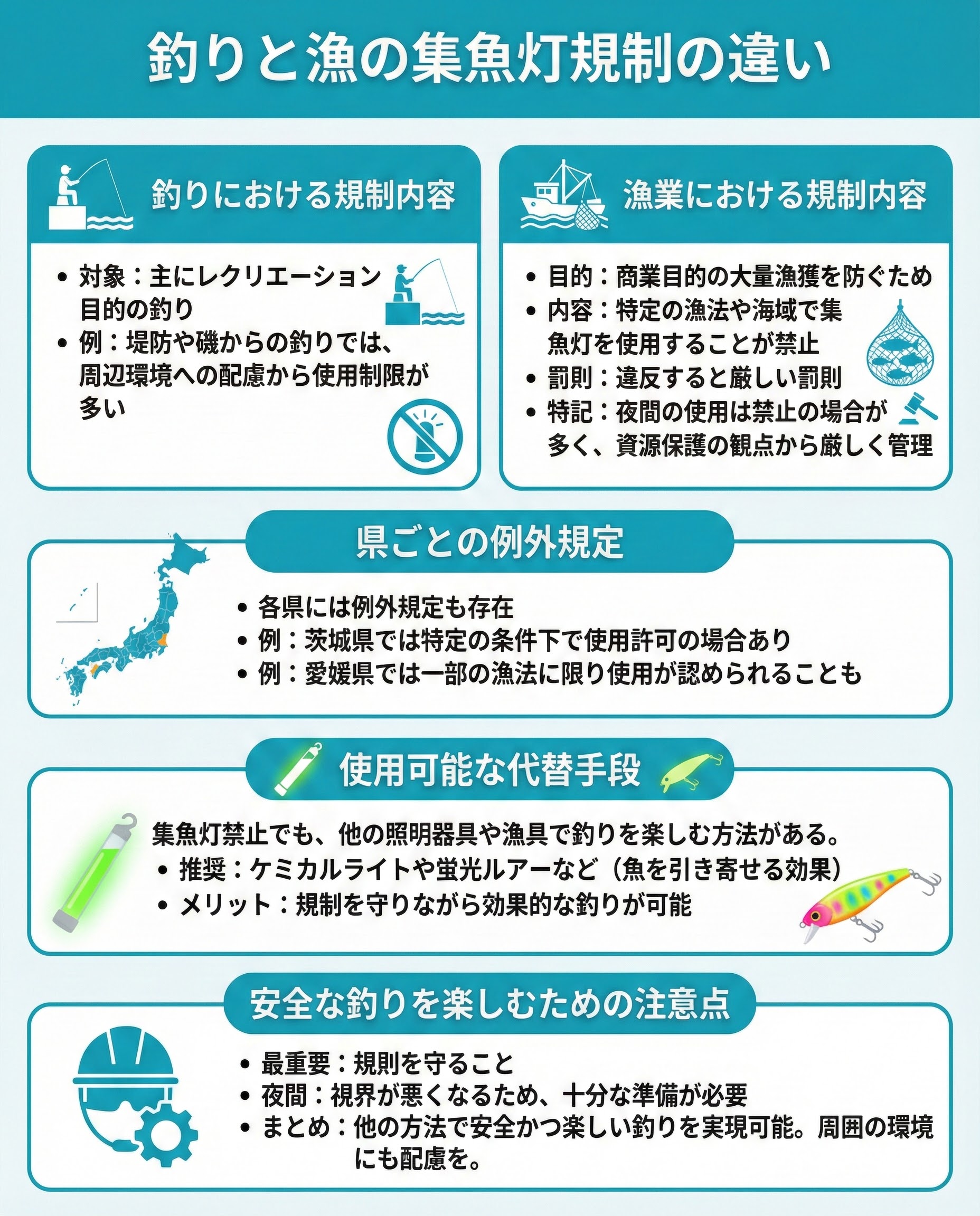 釣りにおける規制内容釣りにおける集魚灯の規制内容は、主にレクリエーション目的の釣りを対象としています。