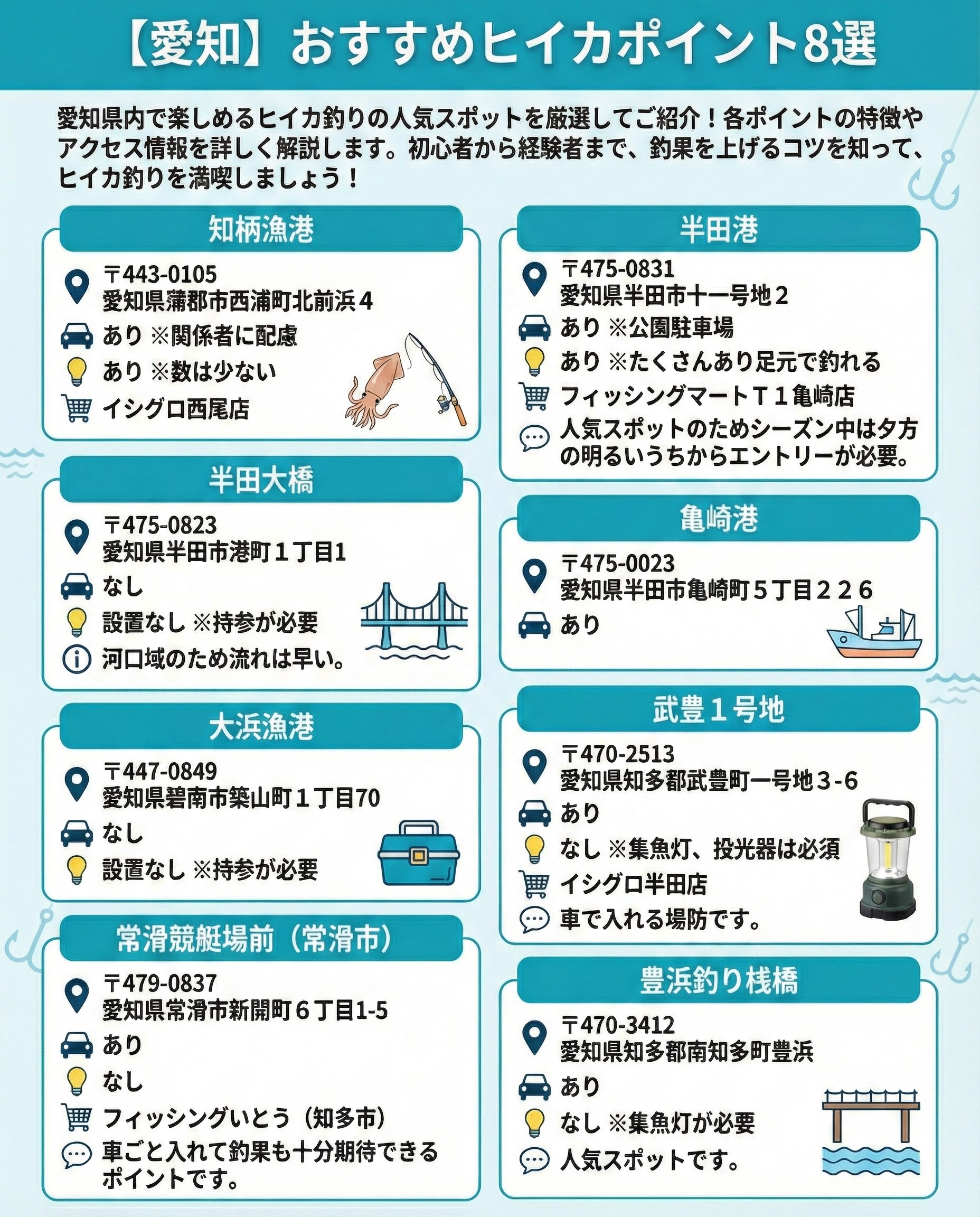- 愛知県内には、知柄漁港や半田港などヒイカ釣りのおすすめスポットが豊富。