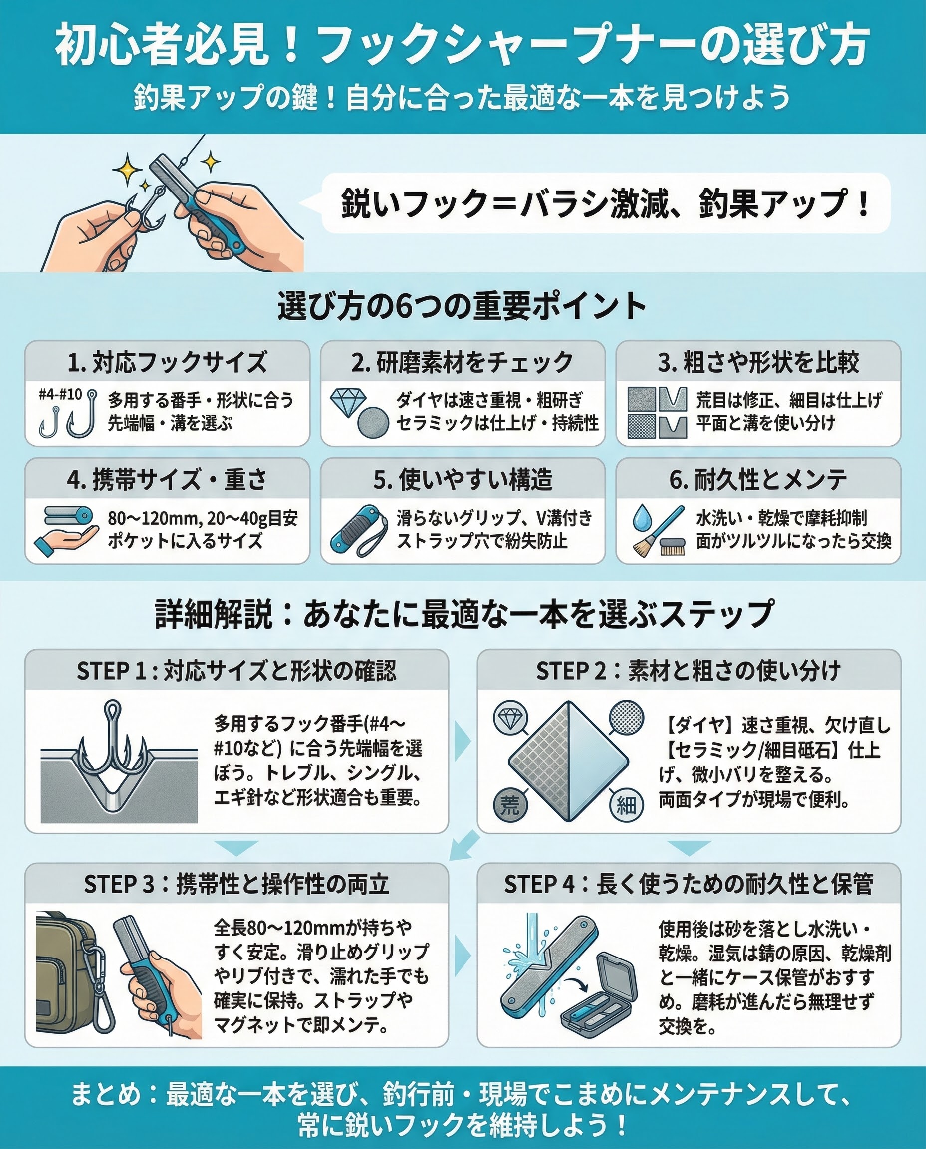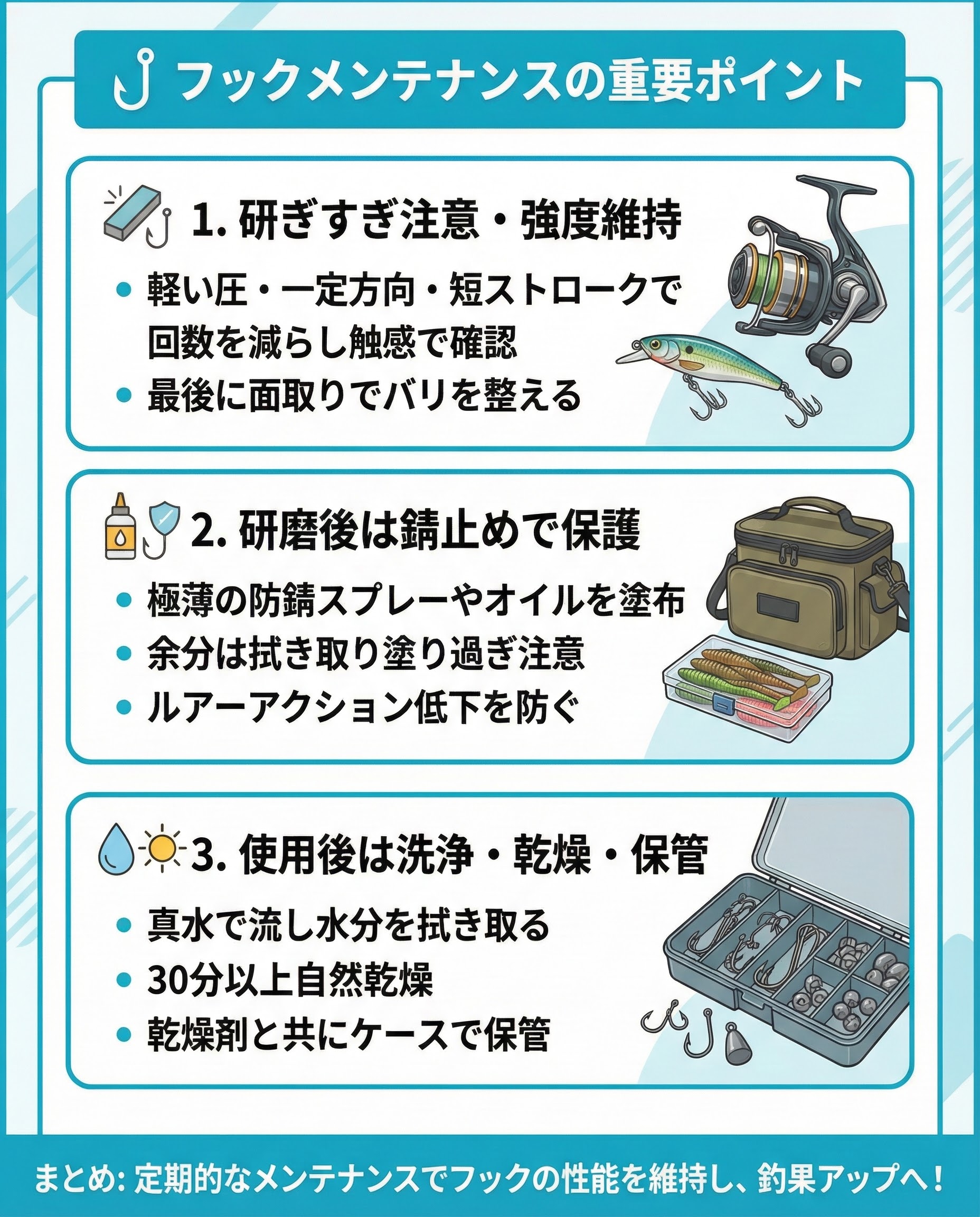 刺さりは釣果の基盤です。自分の釣りに合う1本を常備し、短時間のルーティン整備を徹底すれば、フッキング率と回収率の向上を実感できます。