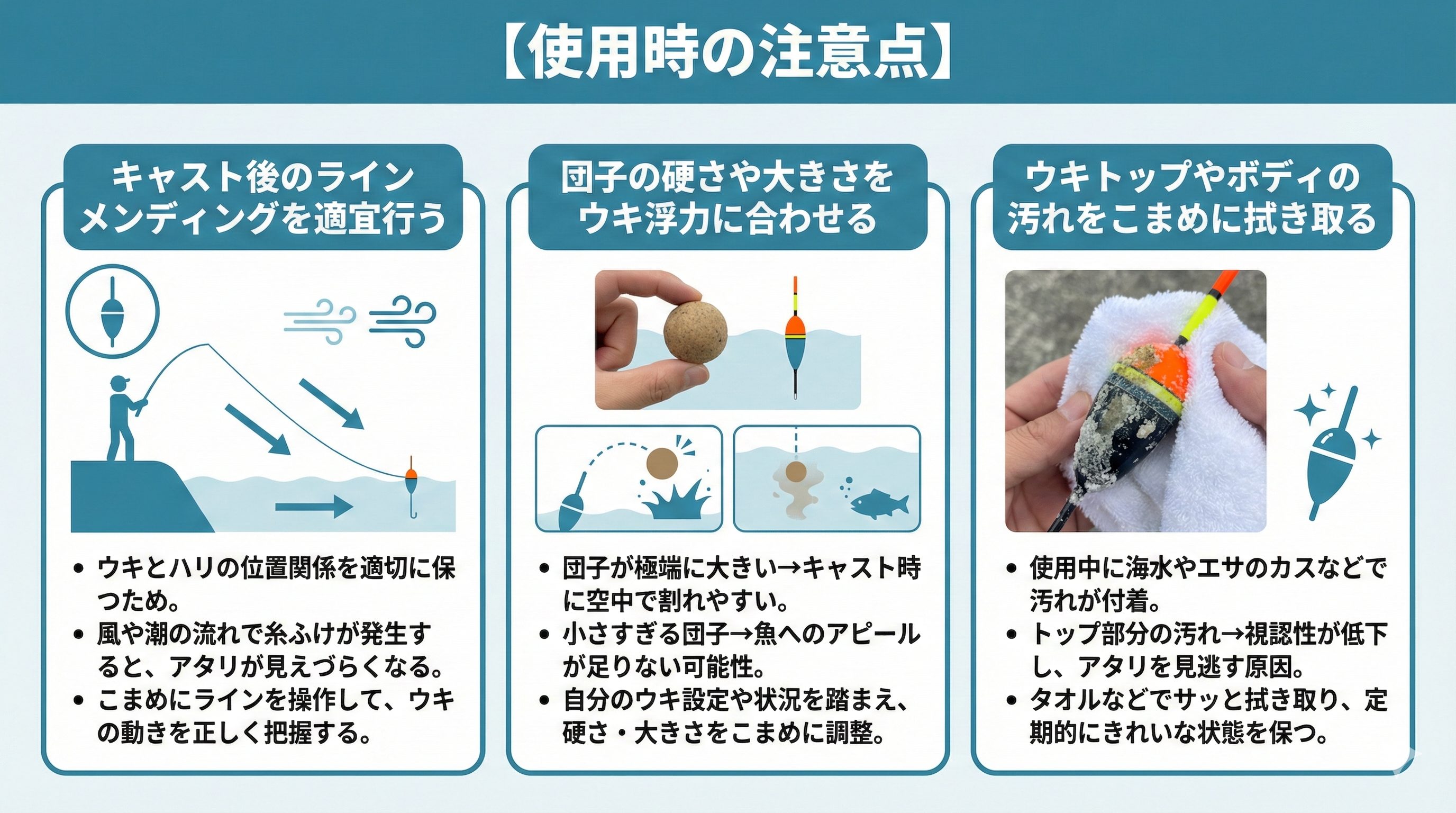 ウキの浮力に対して団子が極端に大きいと、キャスト時に空中で割れやすくなります。逆に小さすぎる団子では魚へのアピールが足りない可能性もあります。自分のウキ設定やポイントの状況を踏まえながら、硬さ・大きさをこまめに調整することが肝心です。