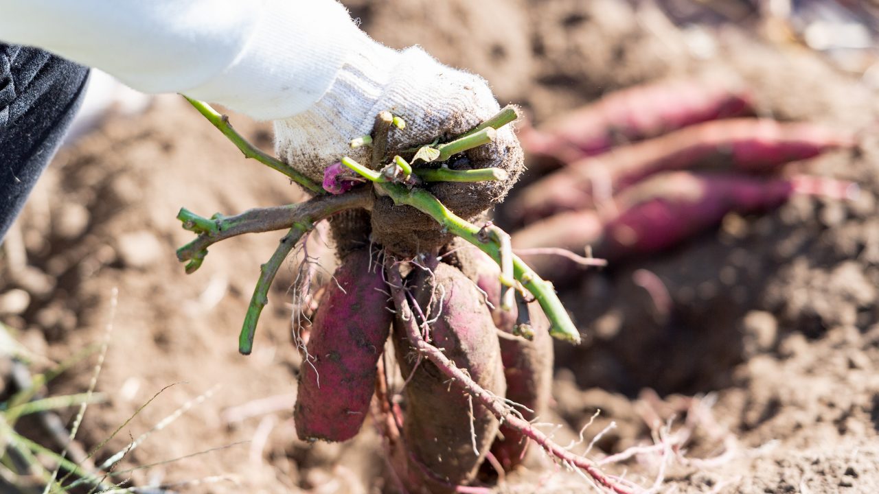 火山灰由来の黒ボク土は通気性が高く手で崩しやすいので、最初は素手で位置確認→必要に応じてフォークで周囲の土を切る順番が安全。芋の肩に金属が当たる傷を大きく減らせます。
