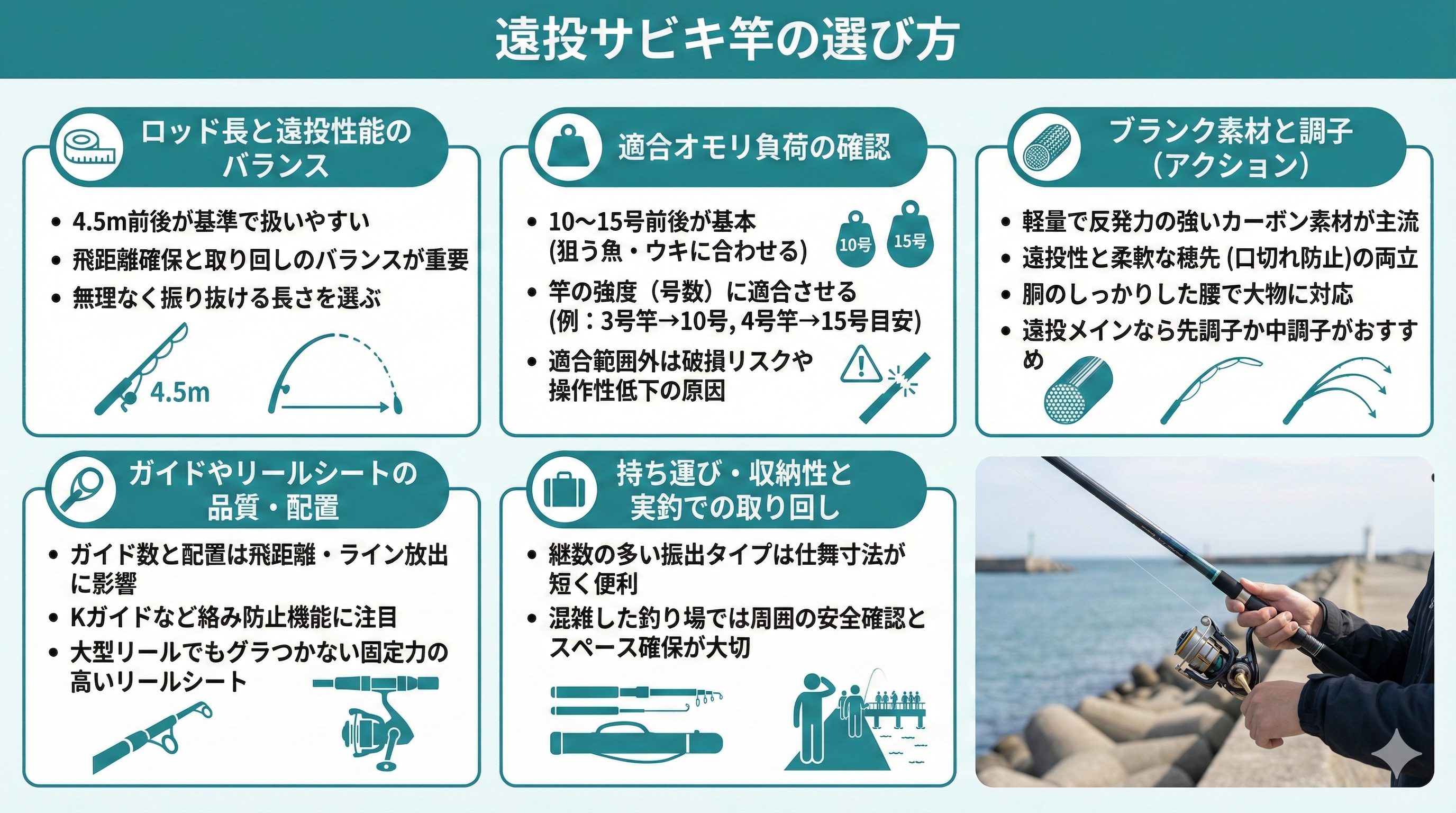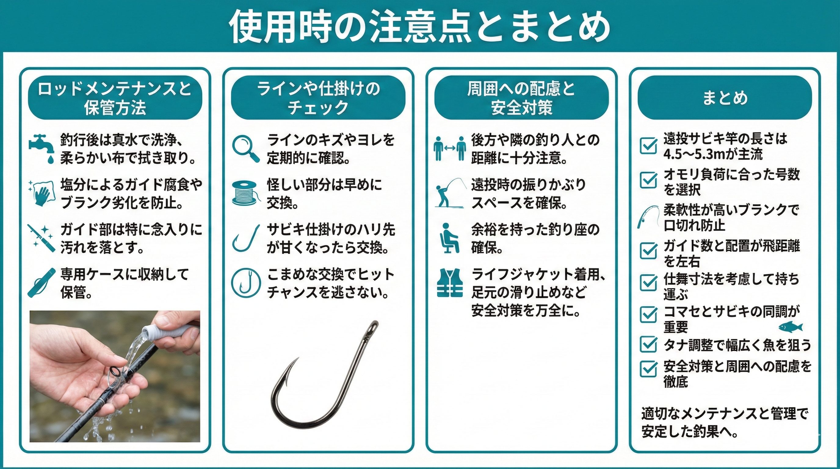 遠投サビキ竿は4.5~5.3mの長さが多く、継数の多い振出タイプなら仕舞寸法も短めに収まります。移動時はロッドケースに入れて保護し、現地での取り回しに慣れるまではゆっくりとキャスト練習をしましょう。特に混雑する堤防では後方の安全確認を徹底し、竿を振りかぶる際のスペース確保が大切です。