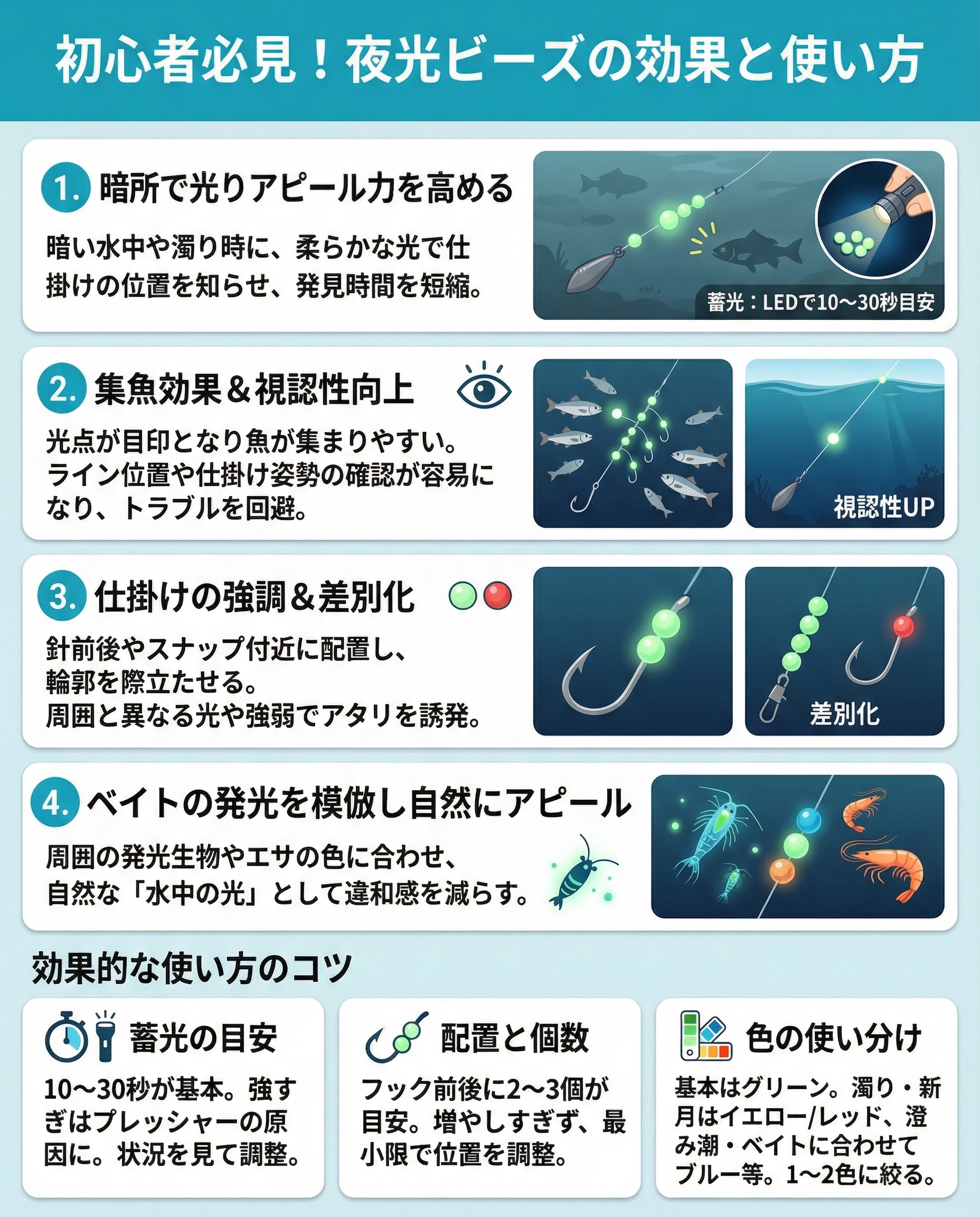 - 夜光ビーズは暗所・深場・濁りで効果大