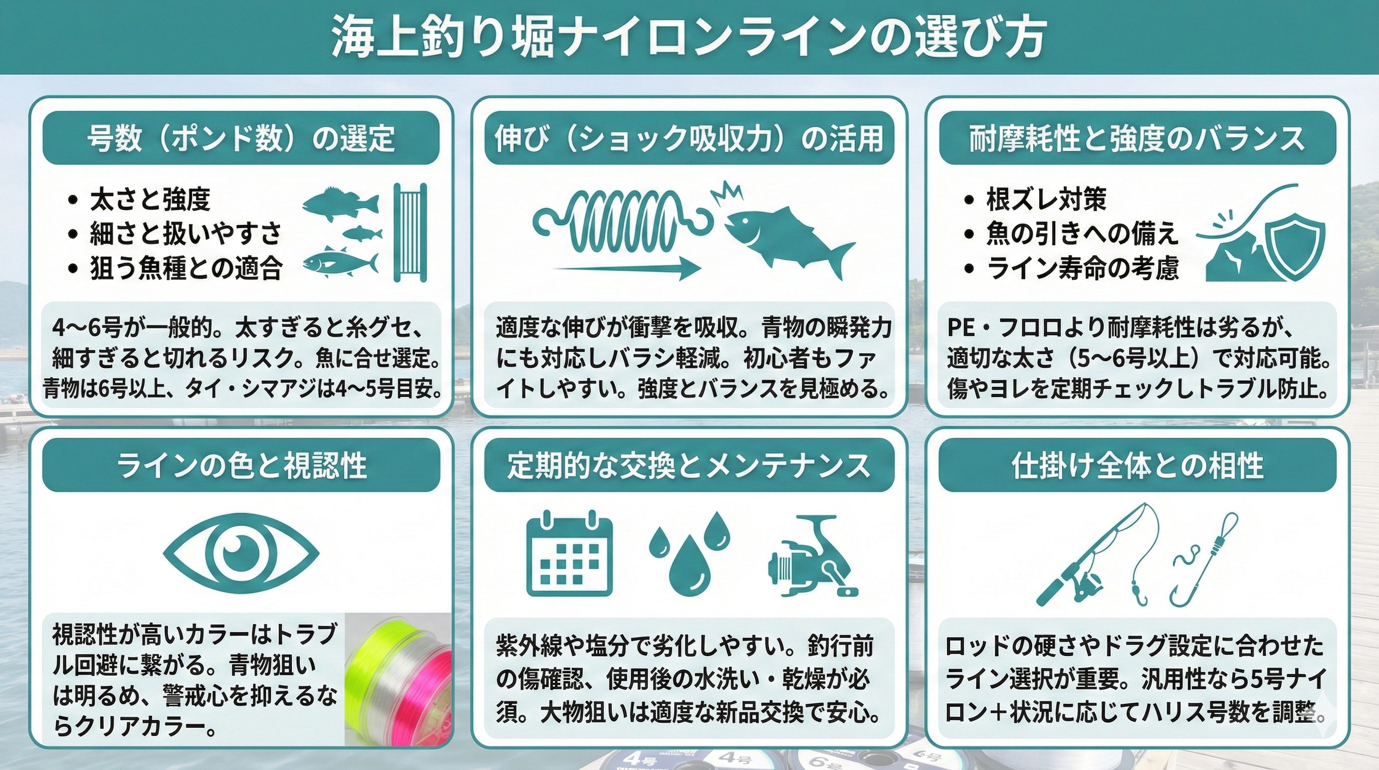 ナイロンラインは、海上釣り堀で扱いやすく初心者にも安心です。太さや色の選び方、メンテナンスを押さえておけば、青物から真鯛まで幅広く対応できます。ぜひ今回のポイントを参考に、快適な釣り堀ライフを楽しんでください。