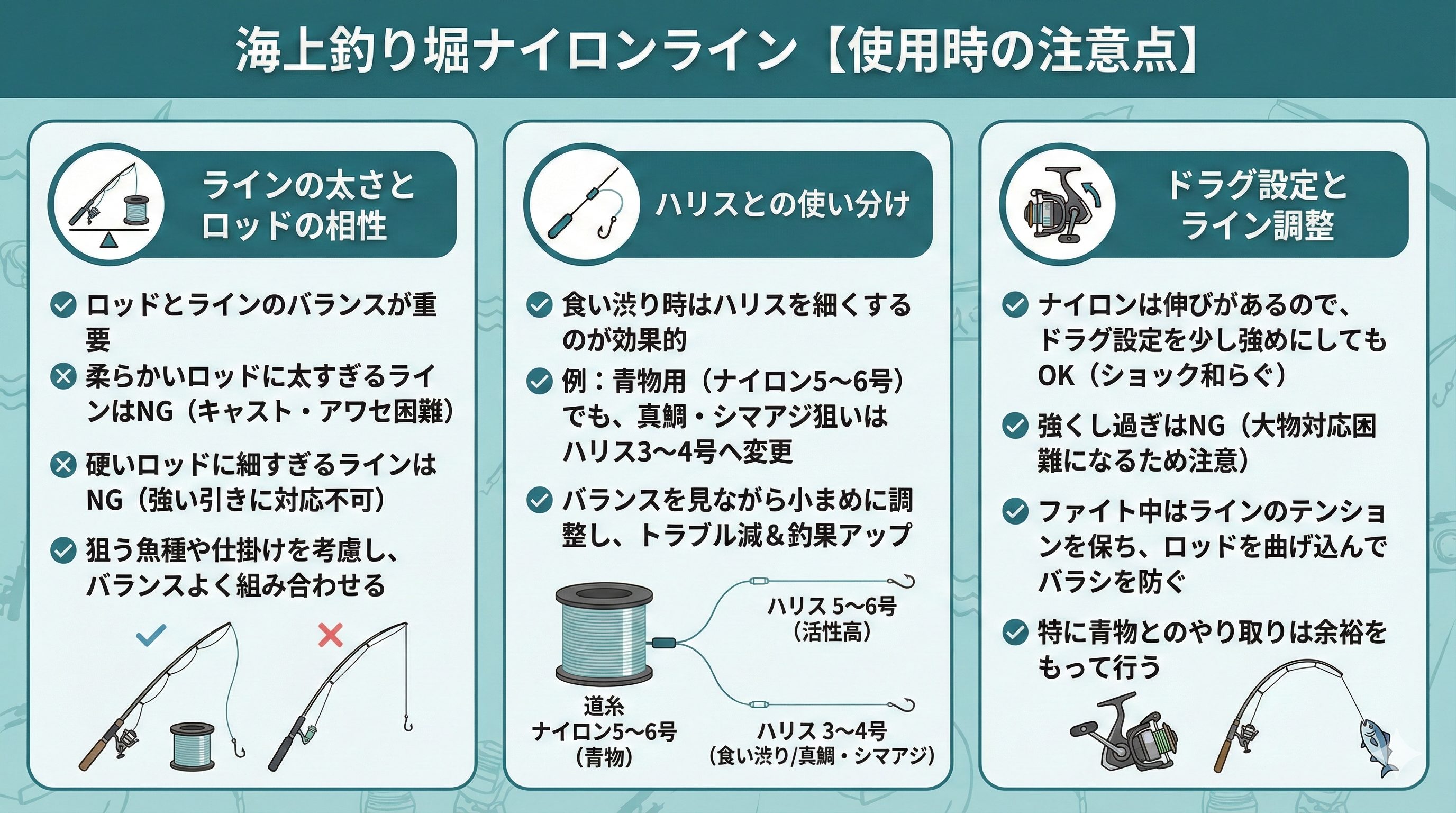 海上釣り堀では、ロッドやリールなど全体のバランスも重要です。ロッドの硬さやドラグ設定に合わせたナイロンラインを使うことで、糸フケや衝撃が最小限に抑えられます。ハリスを太めにすると青物も安心ですが、食いが渋い日は細めハリスに変える工夫が効果的です。