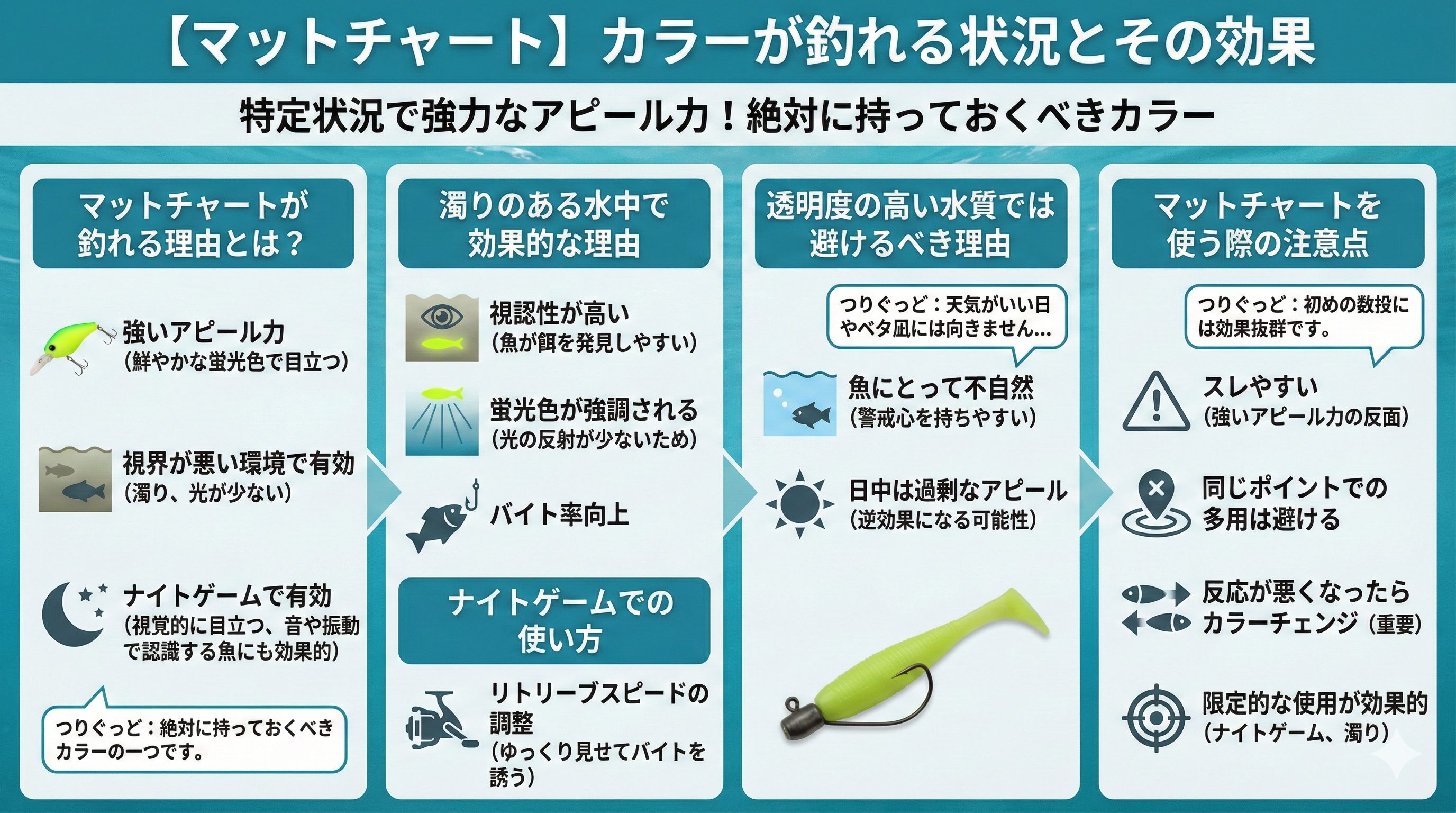 また、ナイトゲームや濁りのある水中での使用に限定することで、スレを防ぎつつ効果的に釣果を上げることができます。