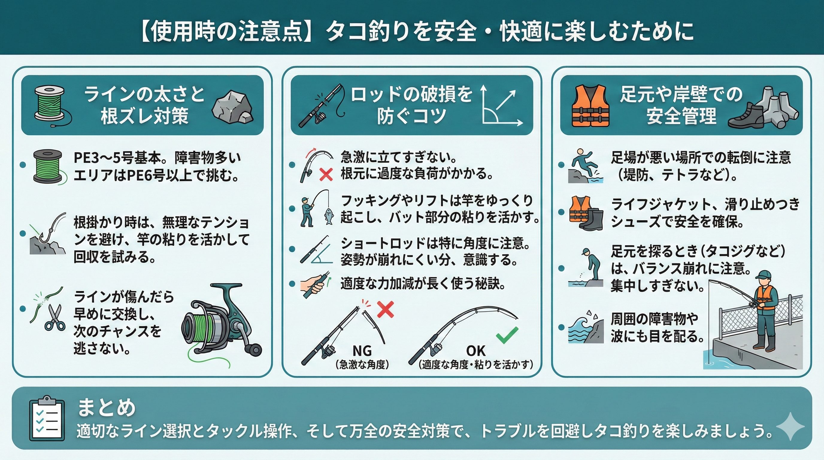 堤防やテトラなどでタコを狙う場合、足場が悪い場所も多く転倒の危険があります。ライフジャケットや滑り止めつきシューズで安全を確保しながら釣りを楽しみましょう。特にタコジグなどで足元を探るときは、ロッド操作に集中しすぎてバランスを崩しやすいので注意が必要です。周囲の障害物や波にも目を配りましょう。