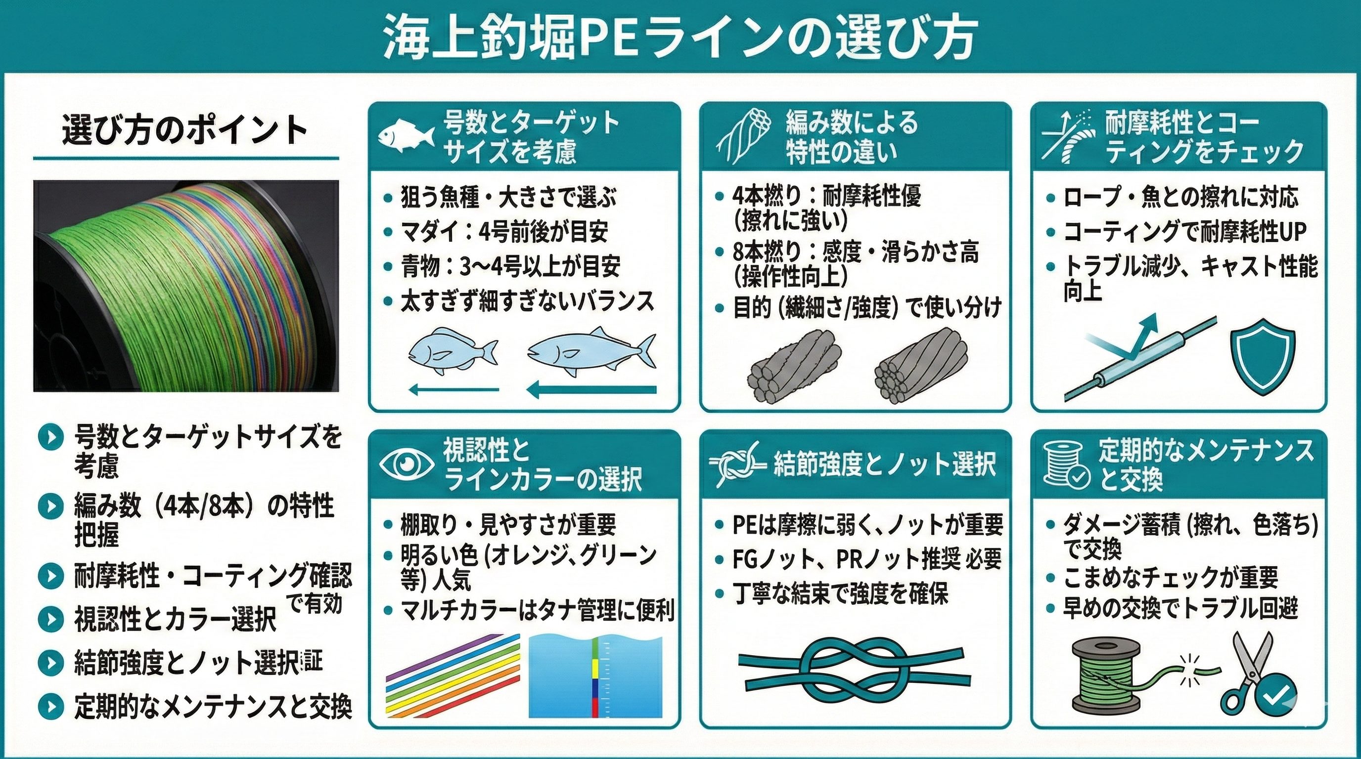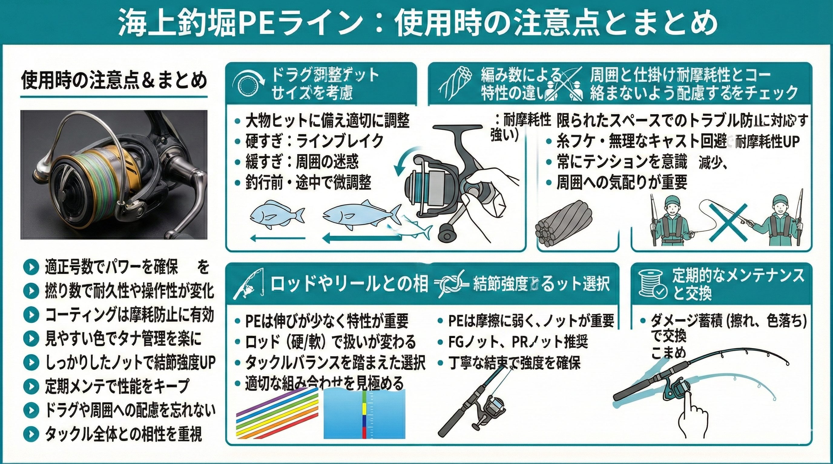 海上釣堀でのPEラインは、ターゲットのサイズや釣り方に合わせた選択とこまめなメンテナンスが大切です。ぜひライン選びを見直して、快適に釣果を伸ばしてください。