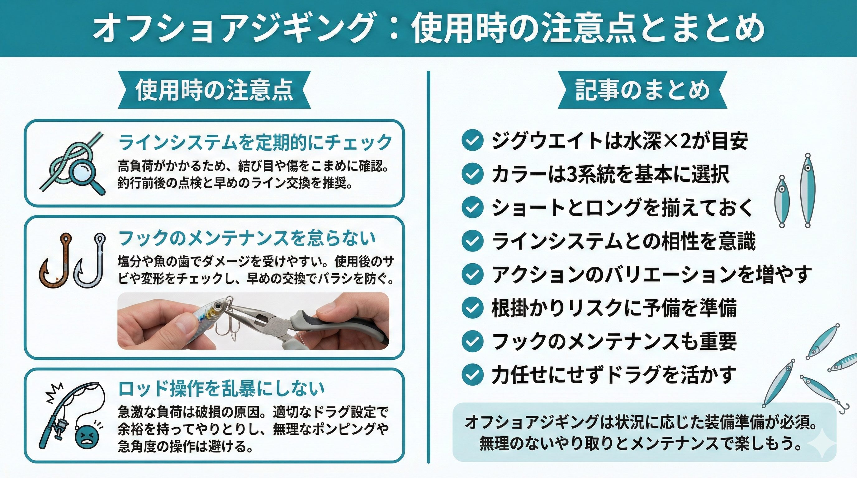 オフショアジギングはジグの選択肢が幅広く、状況に応じた装備を準備しておくことが必須です。ご紹介した選び方とおすすめジグを参考に、ぜひ納得の一本を見つけてみましょう。無理のないやり取りと道具のメンテナンスを心掛ければ、青物の強烈な引きを存分に楽しめます。