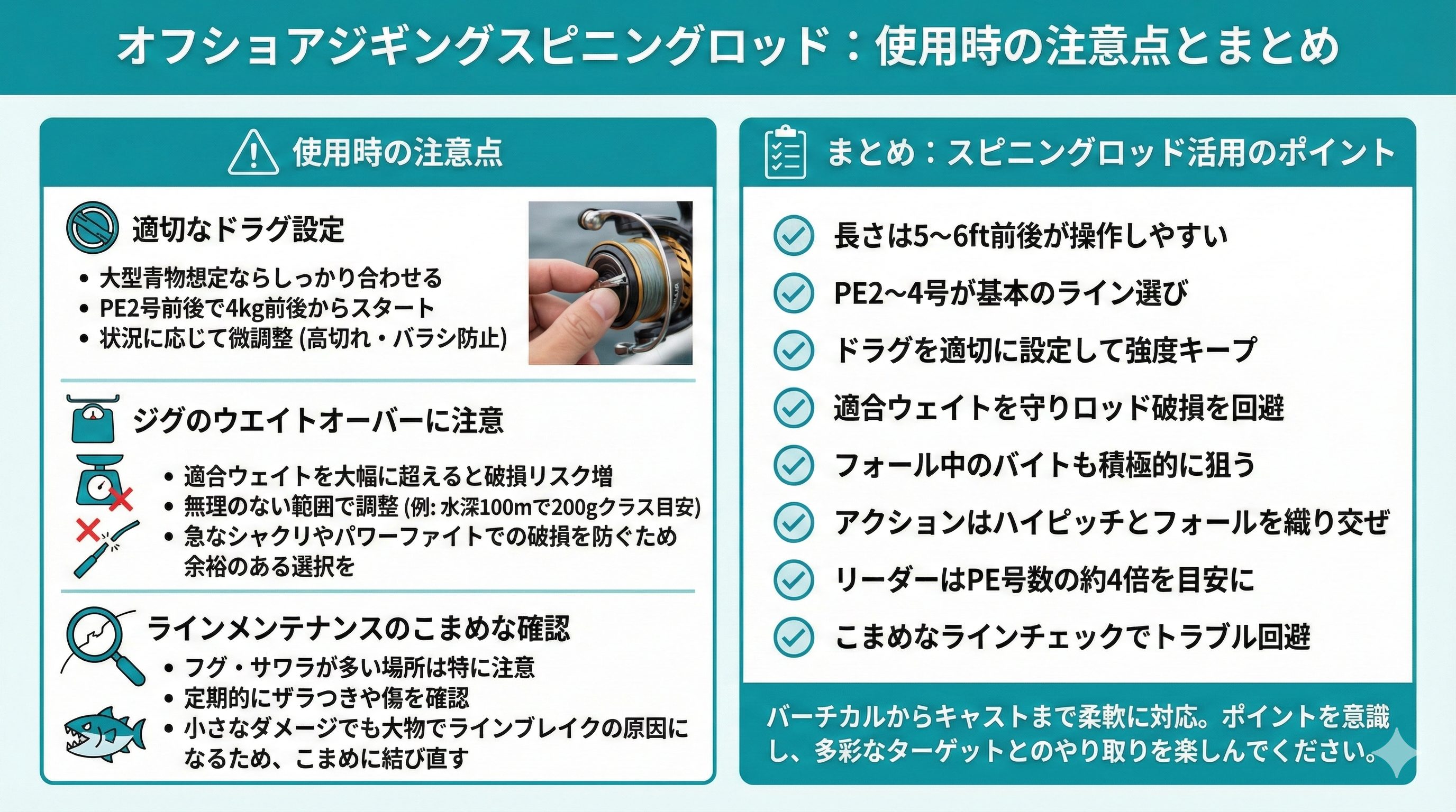 オフショアジギングのスピニングロッドは、バーチカルからキャストアプローチまで柔軟に対応できます。上記のポイントや注意点を意識しつつ、青物や根魚など多彩なターゲットとのやり取りを存分に楽しんでください。