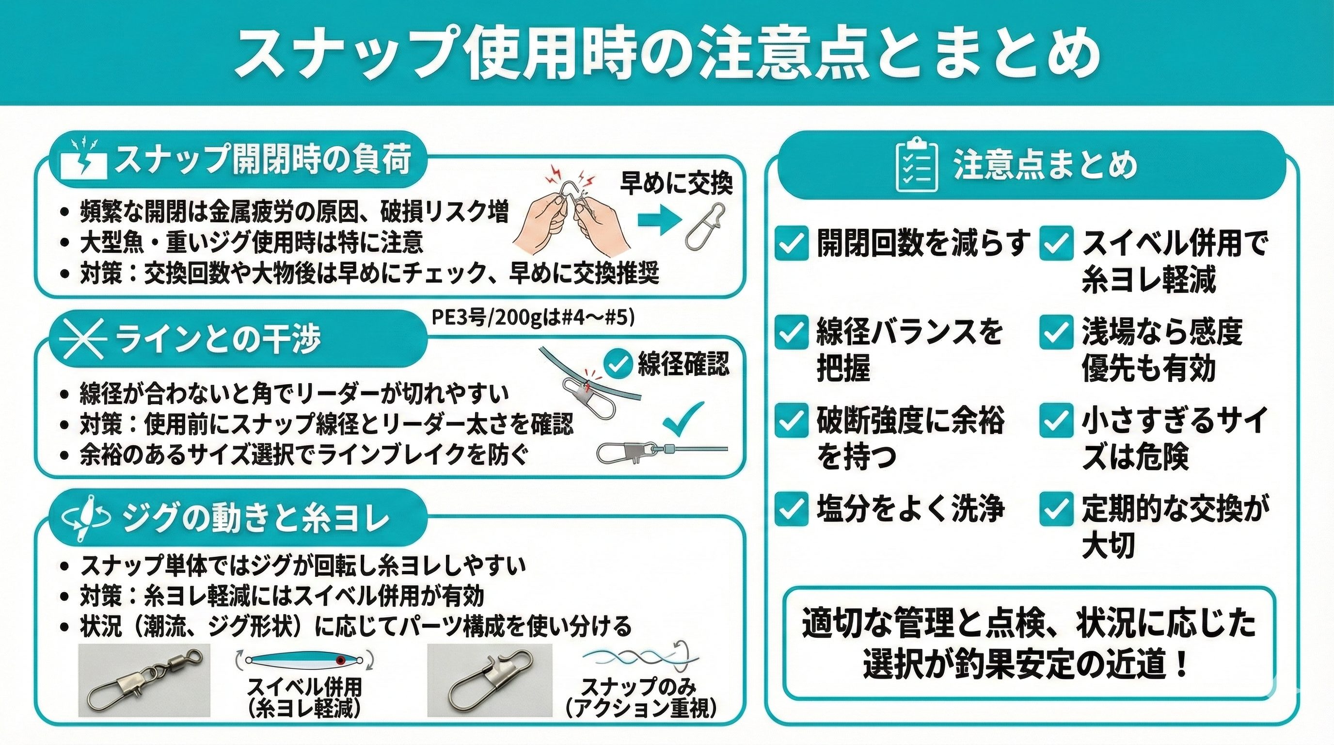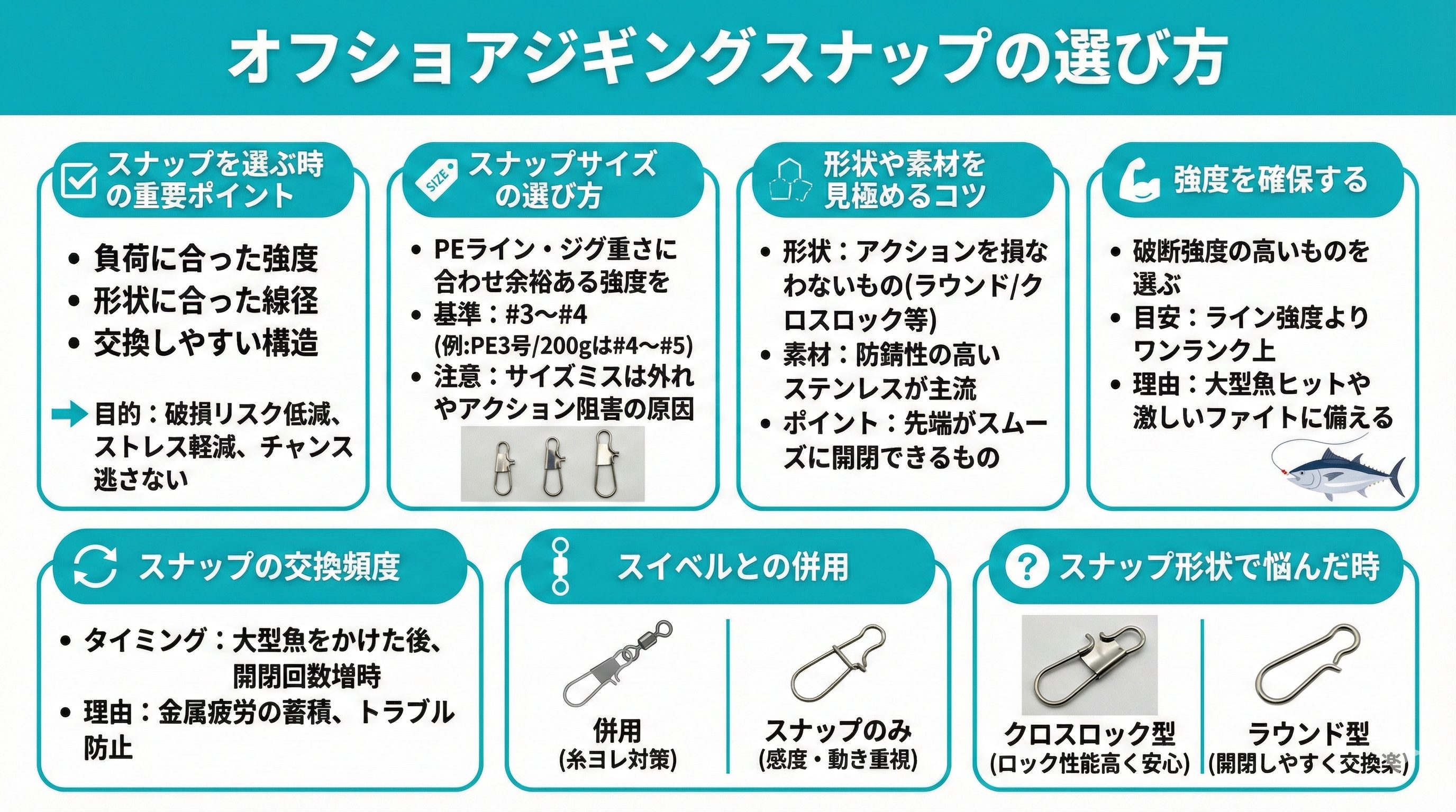 大きめのスナップだとジグが動きづらい場合があります。小さすぎるとラインや結び目が極端に干渉する恐れがあり、扱いにくくなります。適度なサイズが動きと強度のバランスを保ちやすいです。