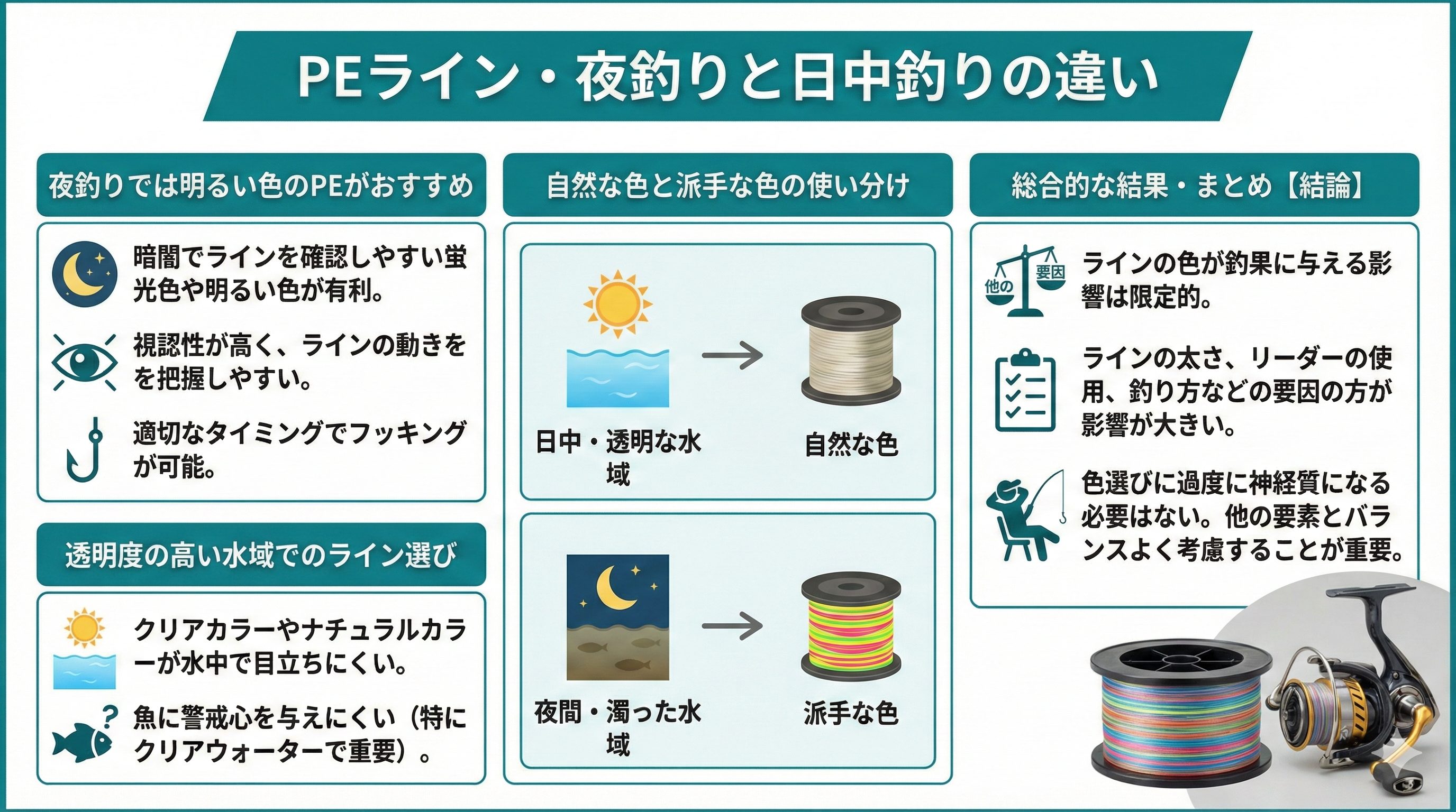 夜釣りでは視認性の高いラインが有利であり、日中の透明度の高い水域では自然な色が好まれる傾向があります。