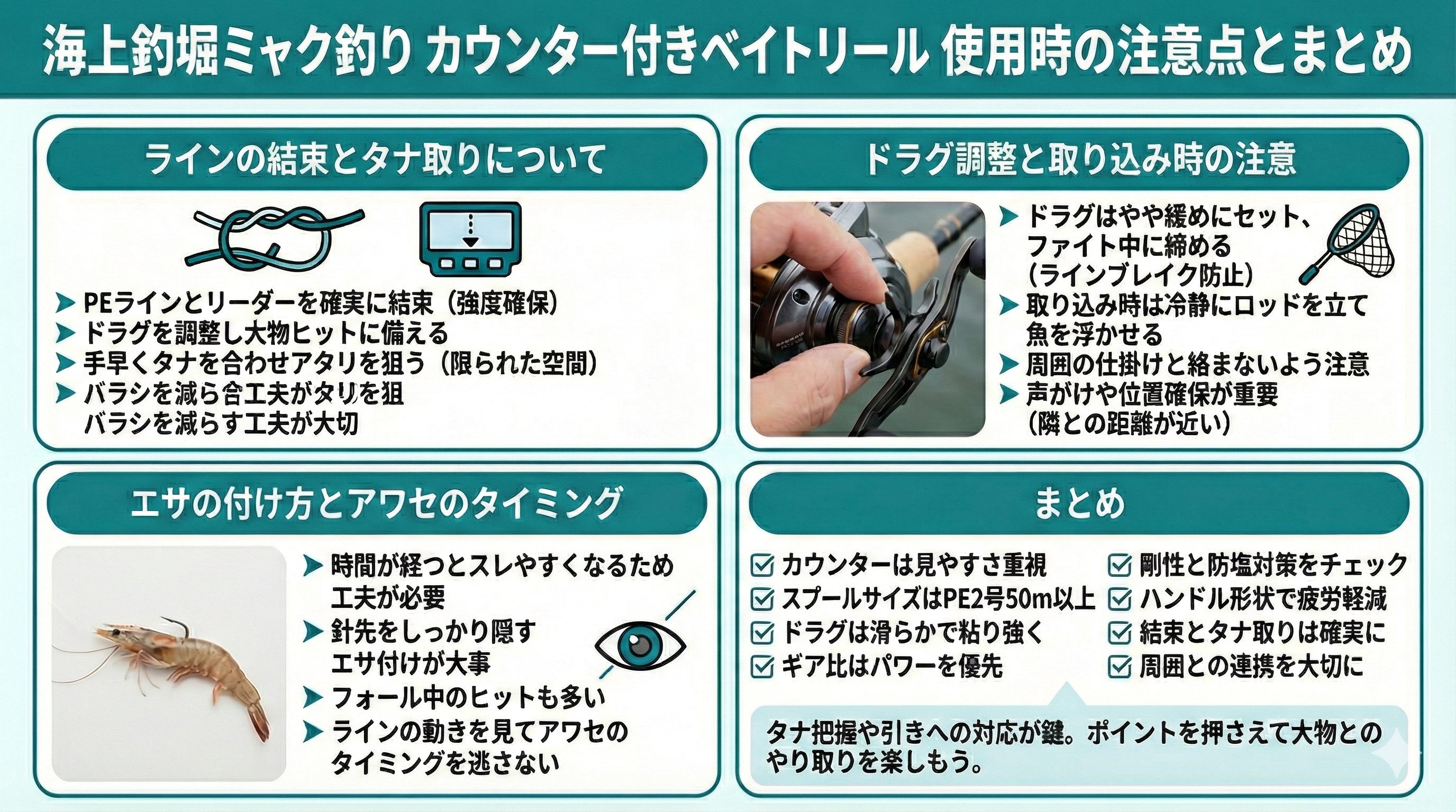 使用時にまず気をつけたいのが、ラインの結束強度とタナ取りの精度です。PEラインとリーダーを確実に結束し、ドラグを調整しておけば、大物がヒットしても安心してファイトできます。海上釣堀は生簀(いけす)の大きさが限られているので、手早くタナを合わせてアタリを狙い、バラシを減らす工夫が大切です。