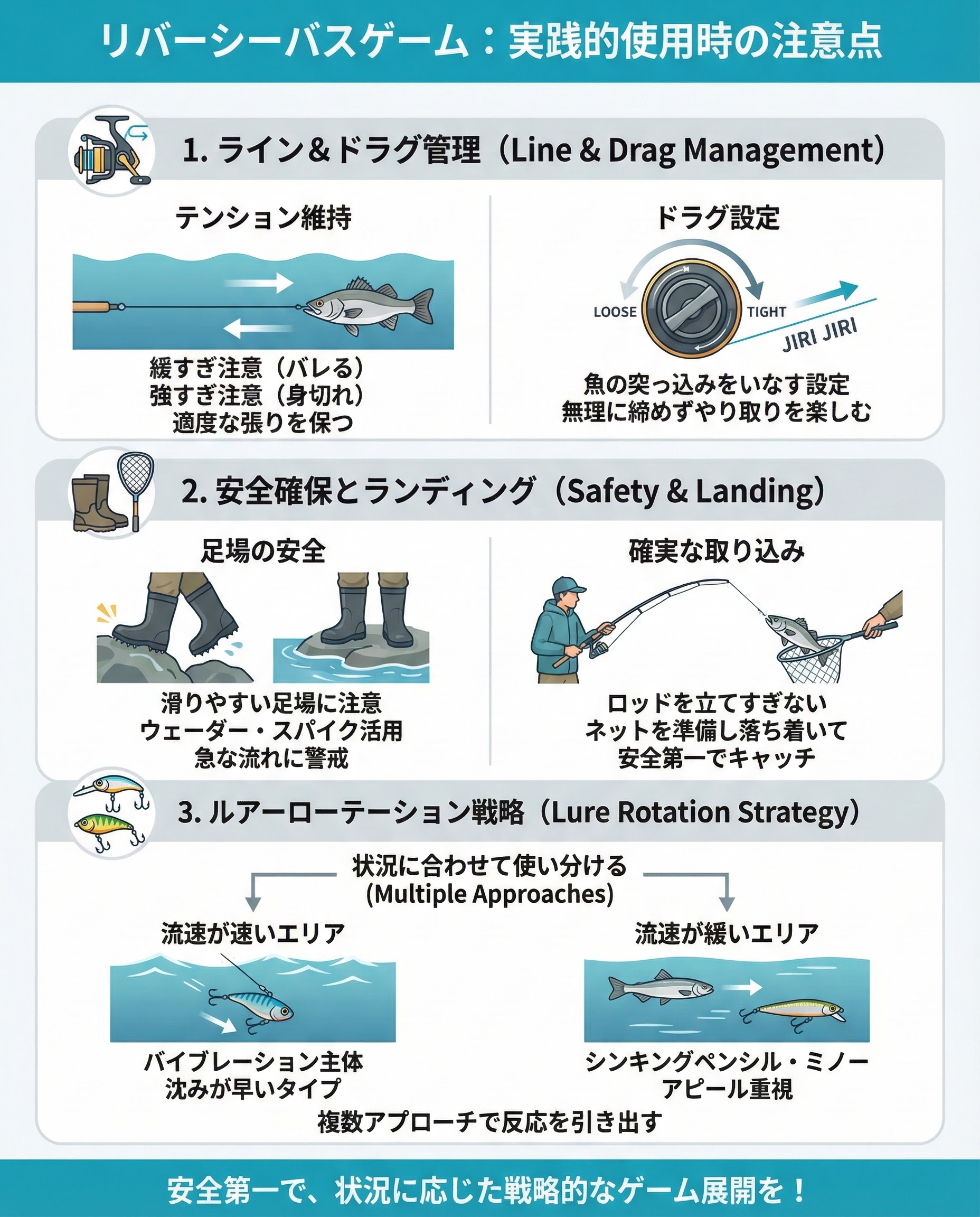 リバーシーバスゲームでは、ミノーやバイブレーション、トップウォーターなどを使い分けると反応を引き出しやすくなります。流速のあるエリアでは沈みが早いバイブを主体に、流れが緩い場所ではシンキングペンシルやミノーなどを試してください。複数のアプローチが釣果アップにつながります。