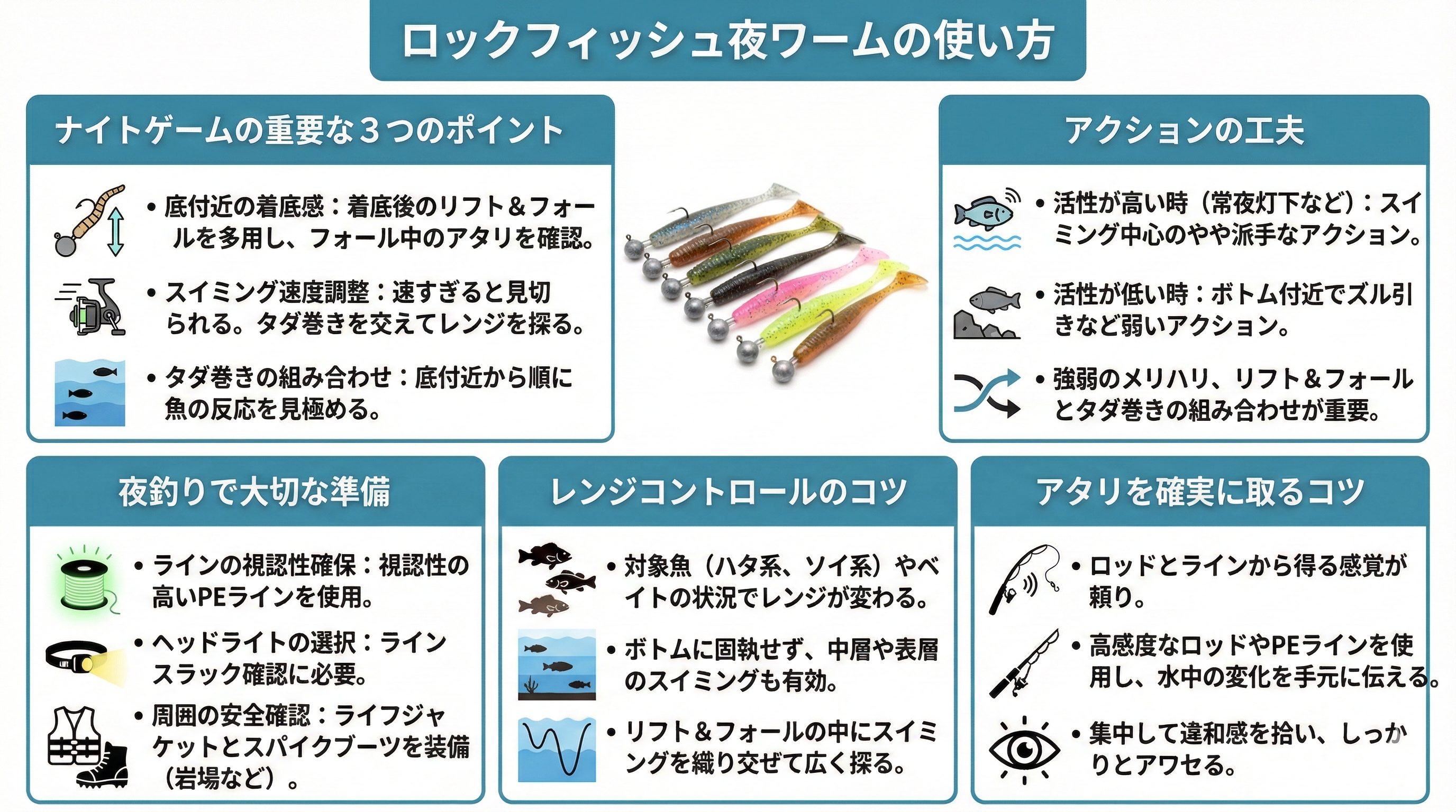 ロックフィッシュの夜釣りは、カラーと使い方次第で大きく釣果が変わります。周囲の安全を確保しつつ、状況に合ったワームのローテーションを実践すれば、より多くの魚と出会える可能性が高まるでしょう。今回のポイントを活かし、ぜひ夜のロックフィッシュを楽しんでみてください。