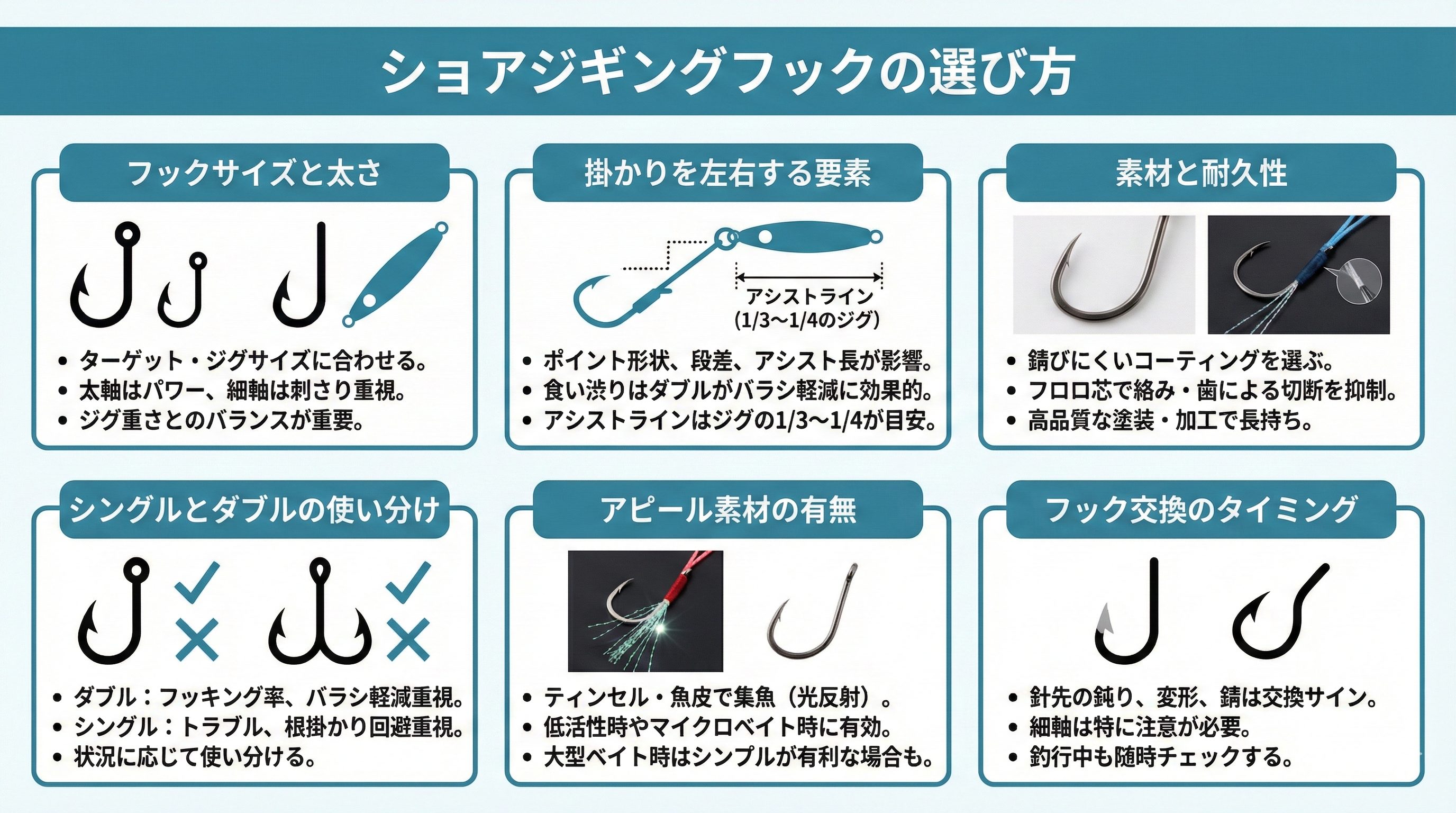 - フックサイズはジグやターゲットに合わせる