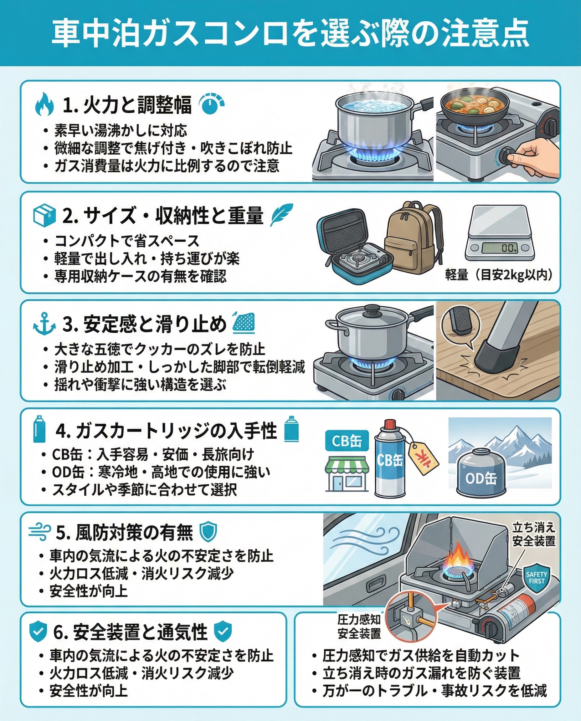車中泊でお湯を沸かしたり簡単な調理をするとき、ガスコンロはとても便利です。ただし、安全面や使いやすさをしっかり確認して選ぶことが大切になります。この記事では車中泊ガスコンロを選ぶ際に押さえておきたいポイントや、おすすめの商品、そして使用時の注意点をまとめて解説します。