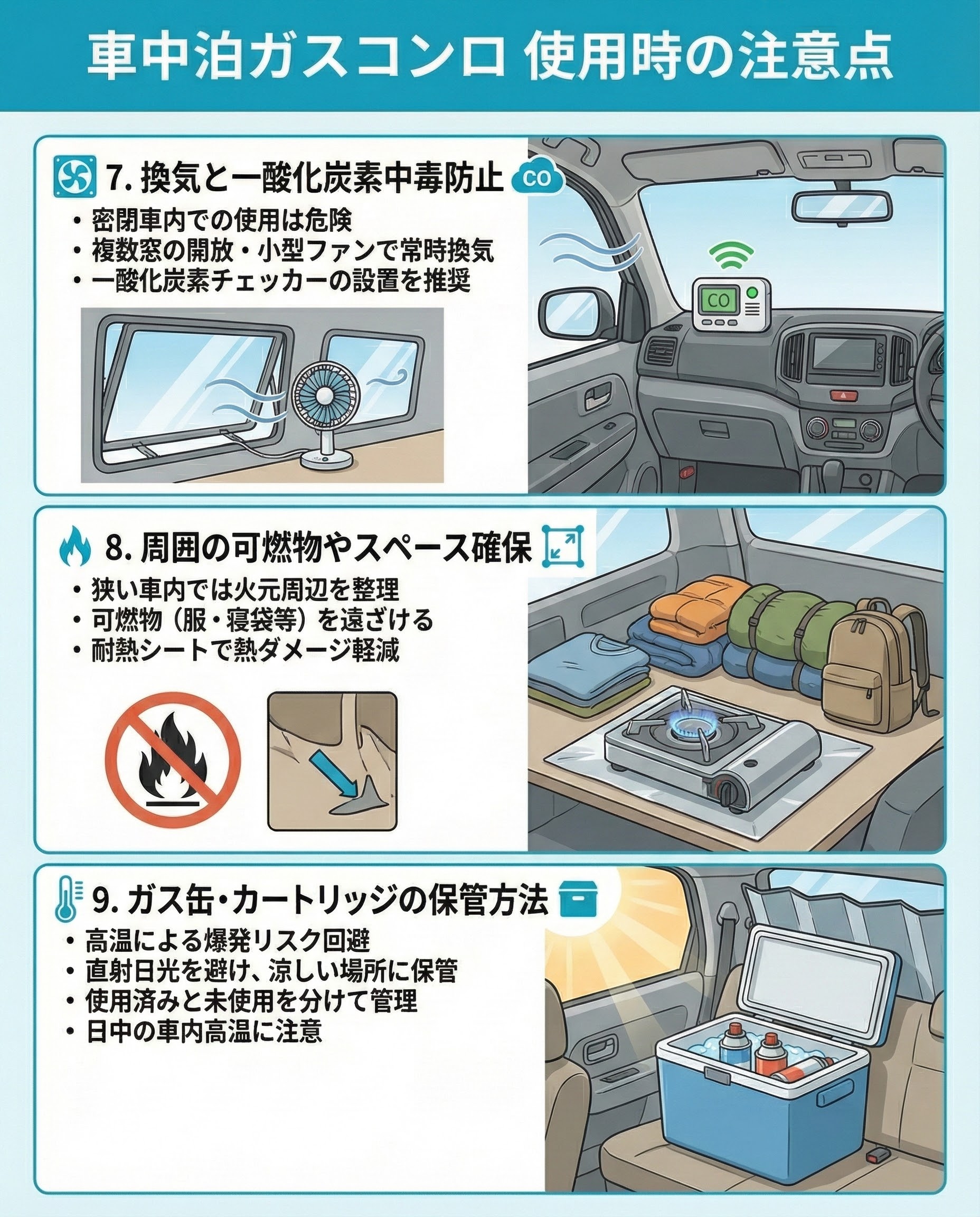 密閉された車内でガスコンロを使う際は、酸欠だけでなく一酸化炭素中毒のリスクも高まります。必ず複数の窓を開ける、または小型ファンを使って空気を入れ替えるなど、常に換気を意識しましょう。さらに、一酸化炭素チェッカーを設置すると異常を早期に察知でき、安全性がぐっと高まります。