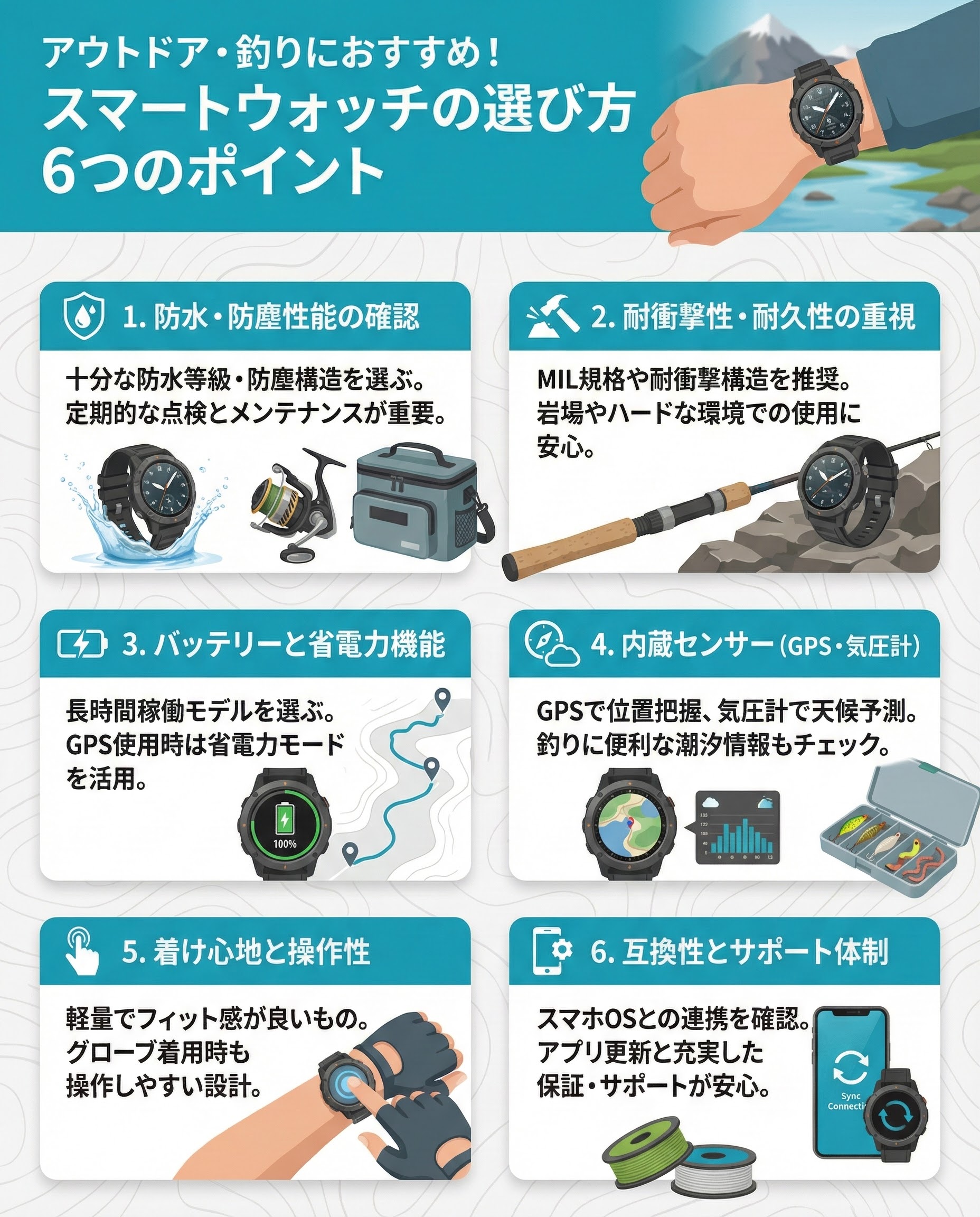 アウトドアや釣りを存分に楽しむには、耐久性やセンサー類など必要な機能を正しく選ぶことが重要です。防水やバッテリーなどを考慮したうえで、快適な装着感も踏まえて検討しましょう。自分に合う一本を見つければ、フィールドでの体験をより豊かにしてくれます。