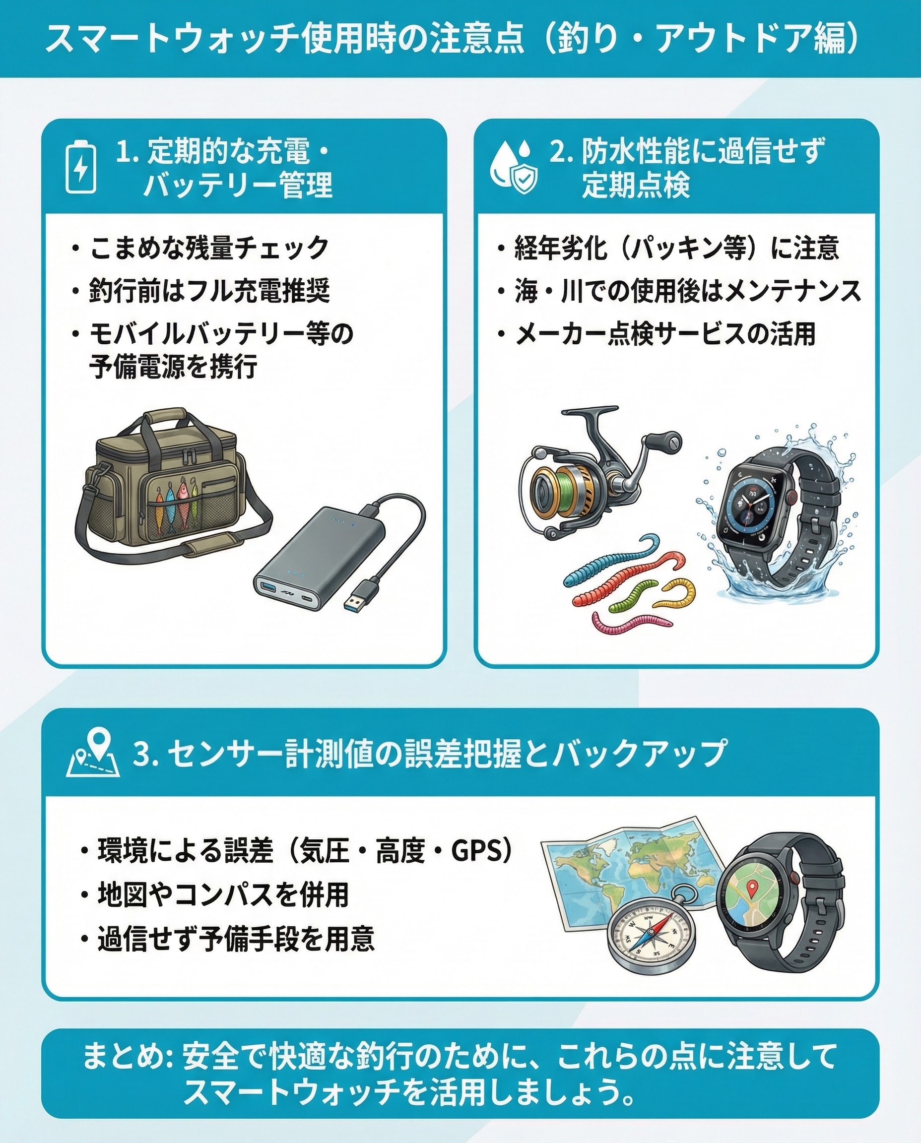 アウトドアや釣りでスマートウォッチを使うなら、水しぶきやホコリが入り込む場面を考慮しなくてはいけません。防水等級が高いモデルや防塵対策が施された構造であれば、渓流釣りやウェーディング時も安心です。ただし防水は経年劣化が起こるため、定期的に水没テストやシーリングの点検を行い、トラブルを未然に防ぐのがおすすめです。