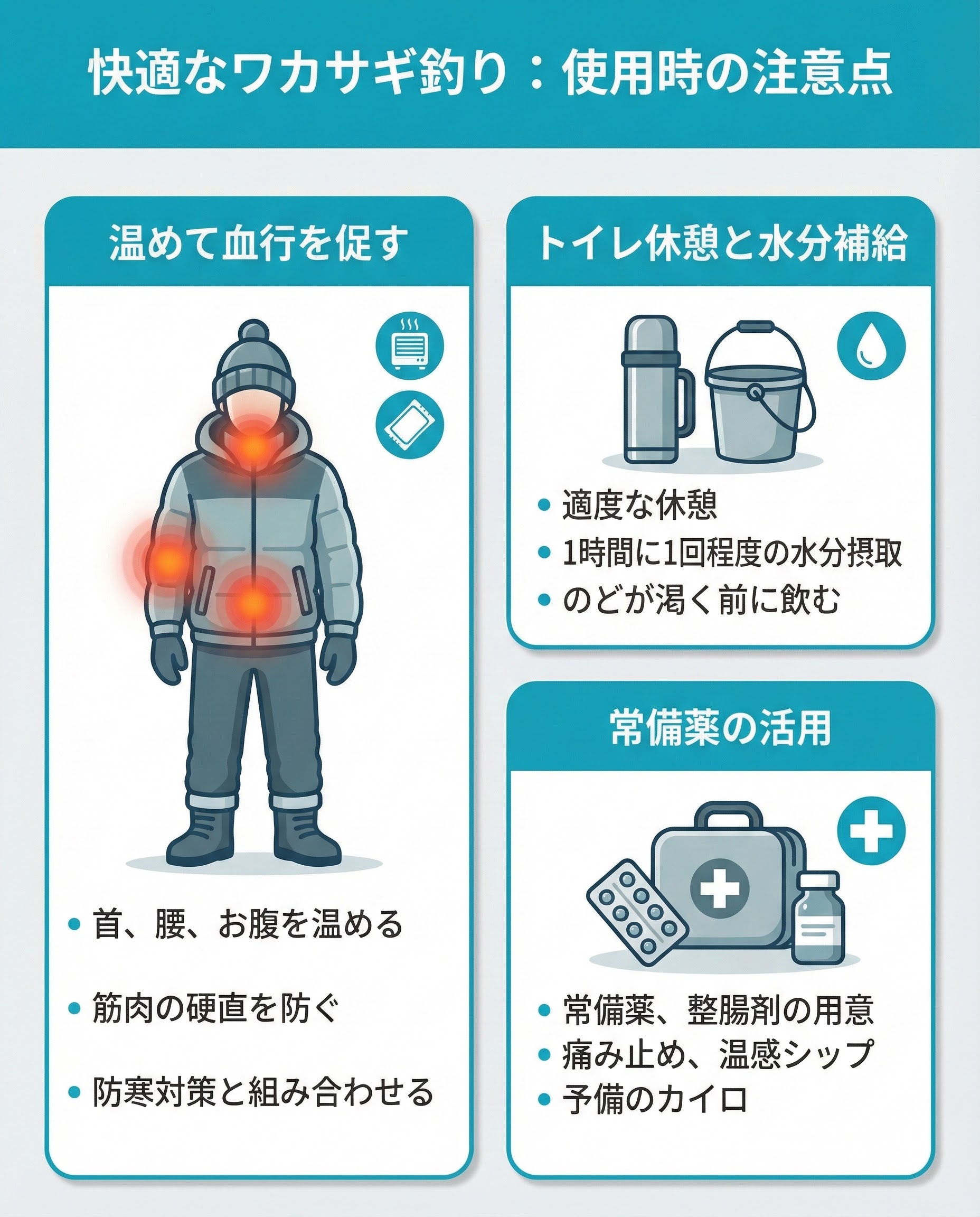 寒い中で長時間座り続けると、腰以外にも胃腸に負担がかかることがあります。あらかじめ常備薬や整腸剤を用意しておけば、万一の体調不良にすぐ対処できます。釣行前に必要な薬をカバンに入れておくと安心です。