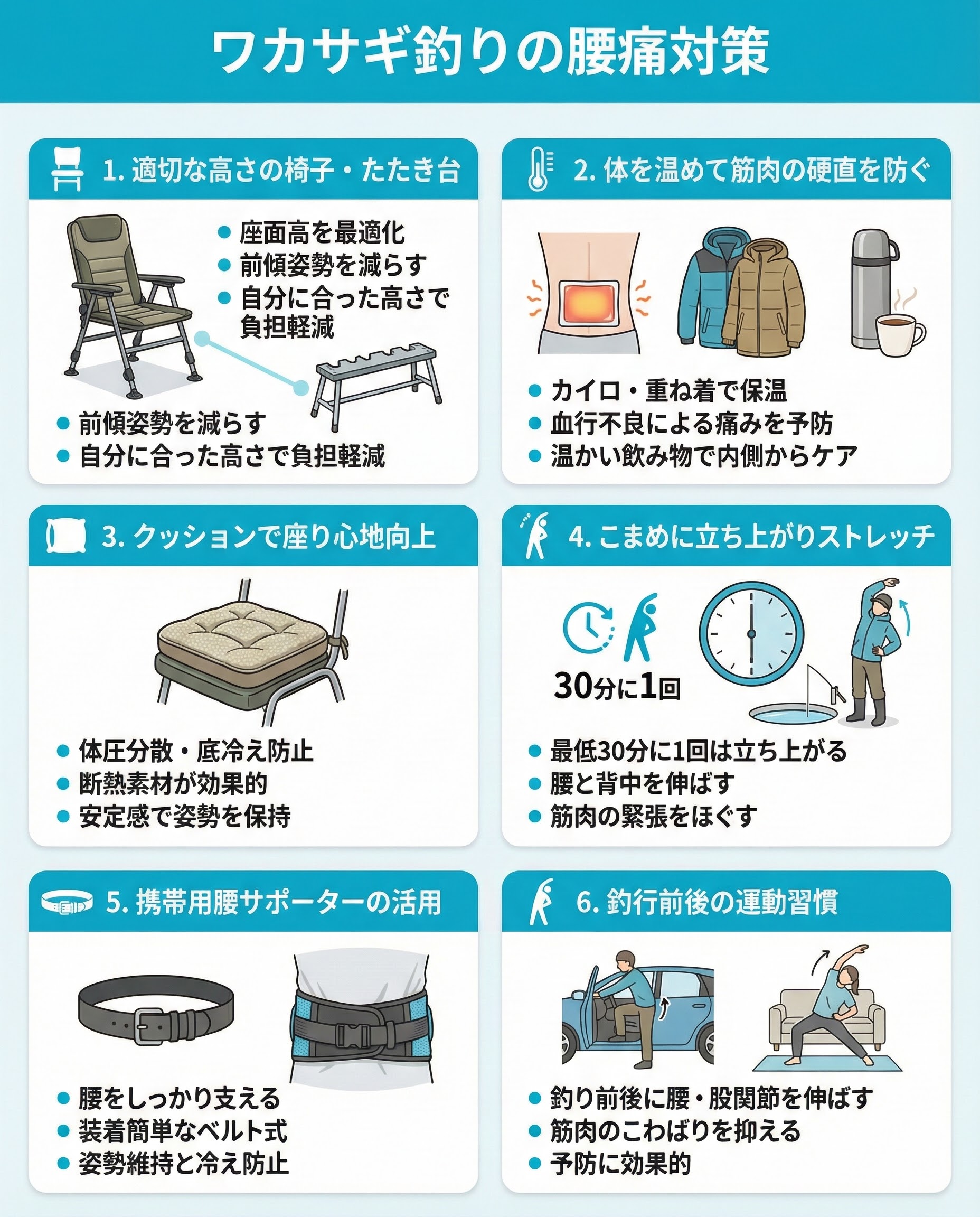 ワカサギ釣りの腰痛対策は、座り方と防寒を中心にグッズを上手に組み合わせるのがポイントです。ぜひ快適な釣りを楽しんでください。