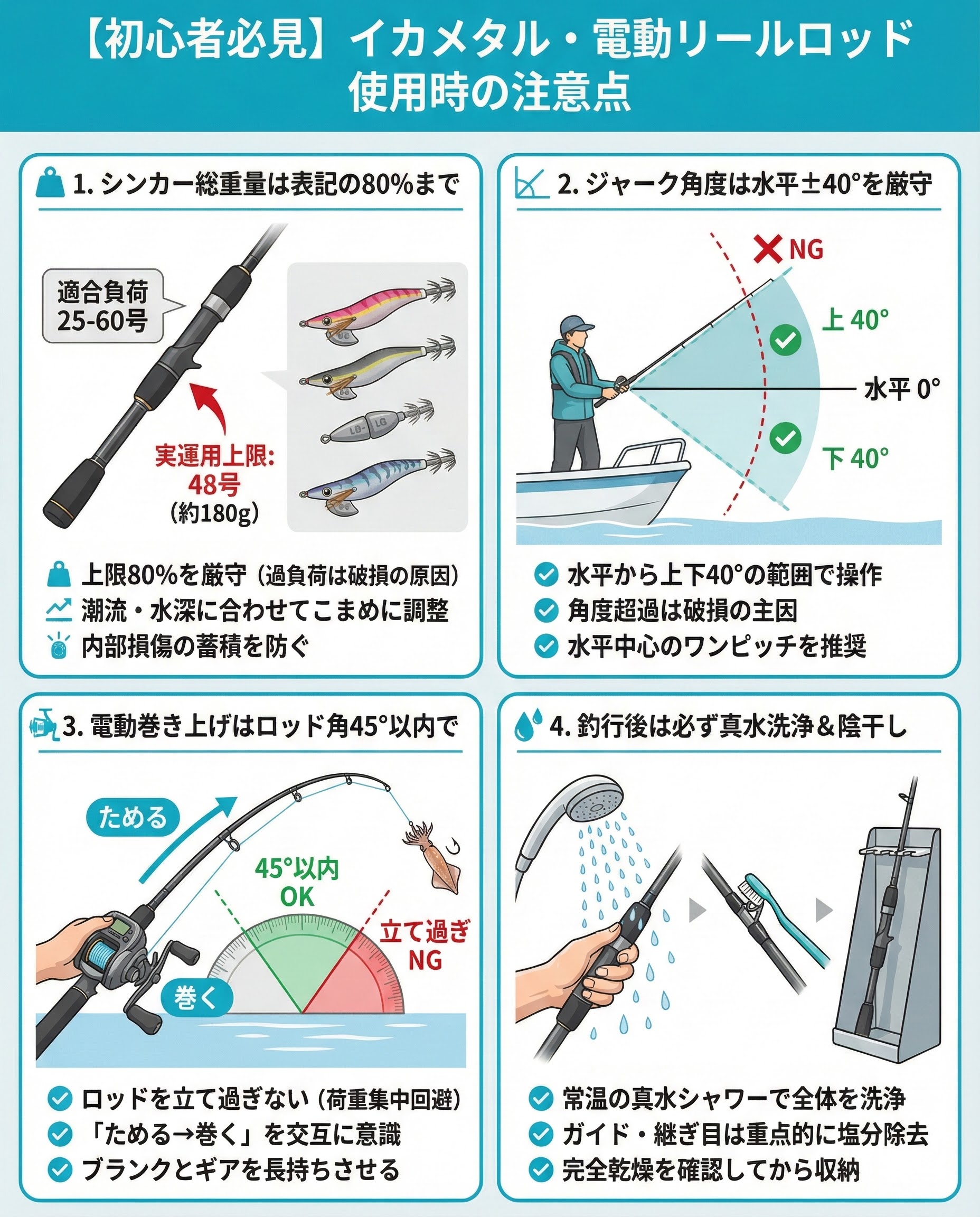 電動リールは一定トルクで巻き上げますが、ロッドを立て過ぎると荷重が一点に集中し折損リスクが急上昇します。45°以内で胴にためを作り、イカの重みが抜けた瞬間にスイッチON。巻きとタメを交互に行うとブランクとギアの両方を長持ちさせられます。