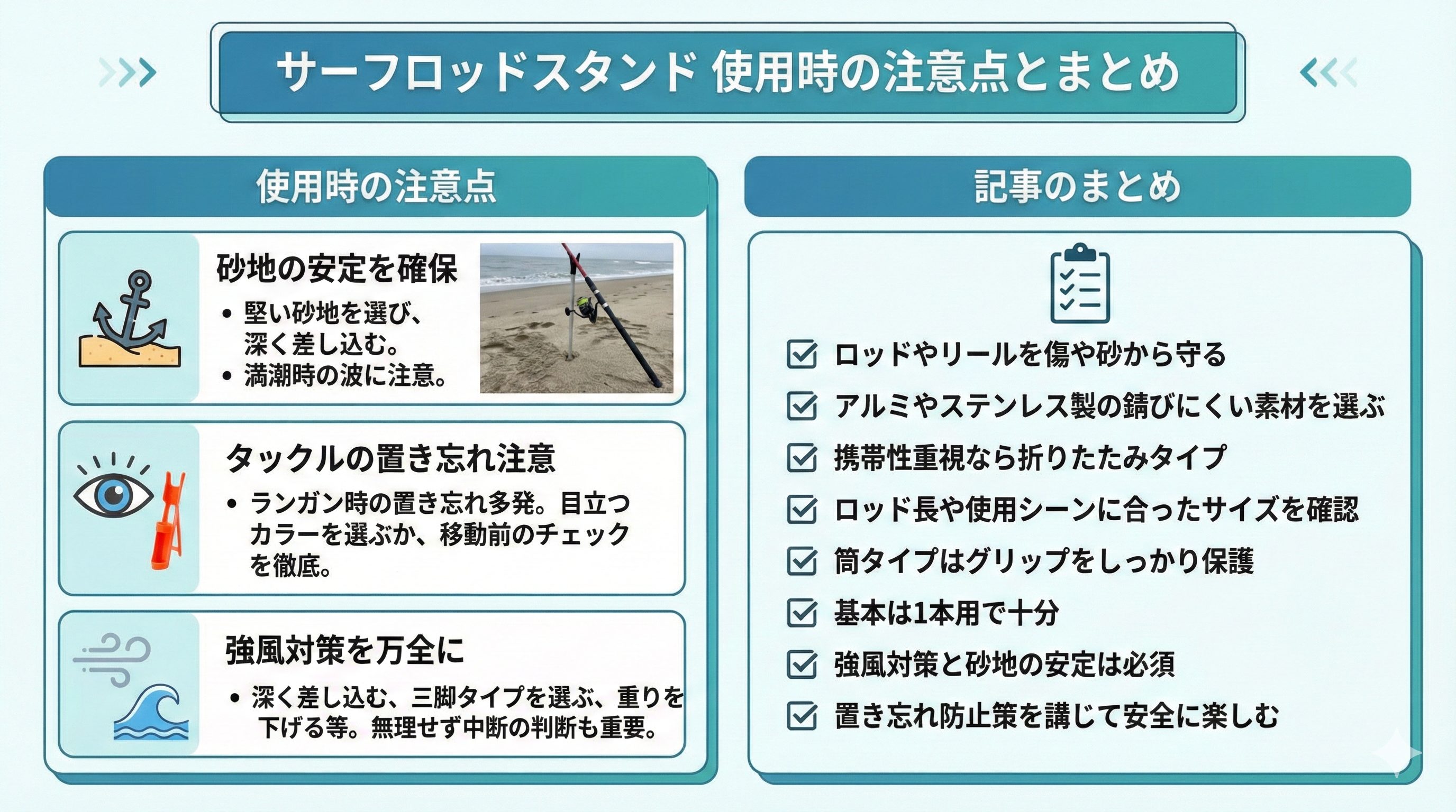 海風が強い日は思いがけない転倒が起こります。スタンドを深く差し込む、もしくは接地面が大きい三脚タイプなら安定性が高いです。タックルへ重りをぶら下げる方法も有効ですが、あまりに強い風なら無理をせず短めの釣行に切り上げる判断も大切です。