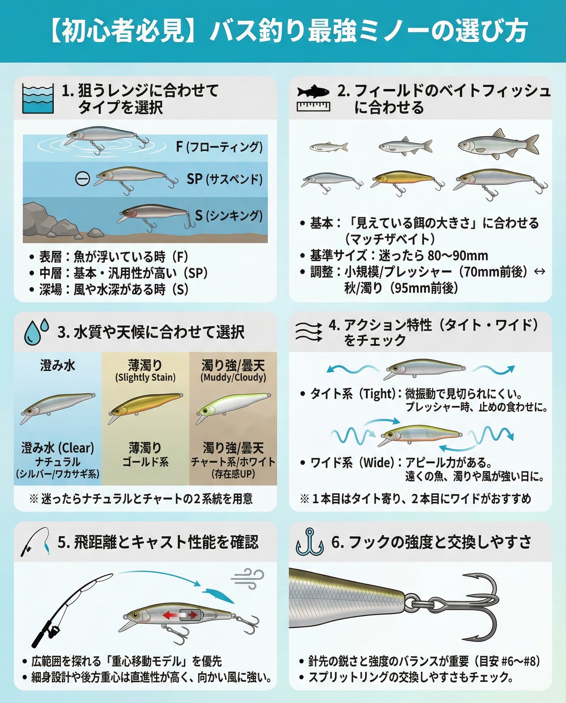 まずは「レンジ基準」でタイプを決め、次にサイズと色で現場に最適化。行く水域と季節に合わせて2〜3本をローテーションできると対応力が一気に高まります。