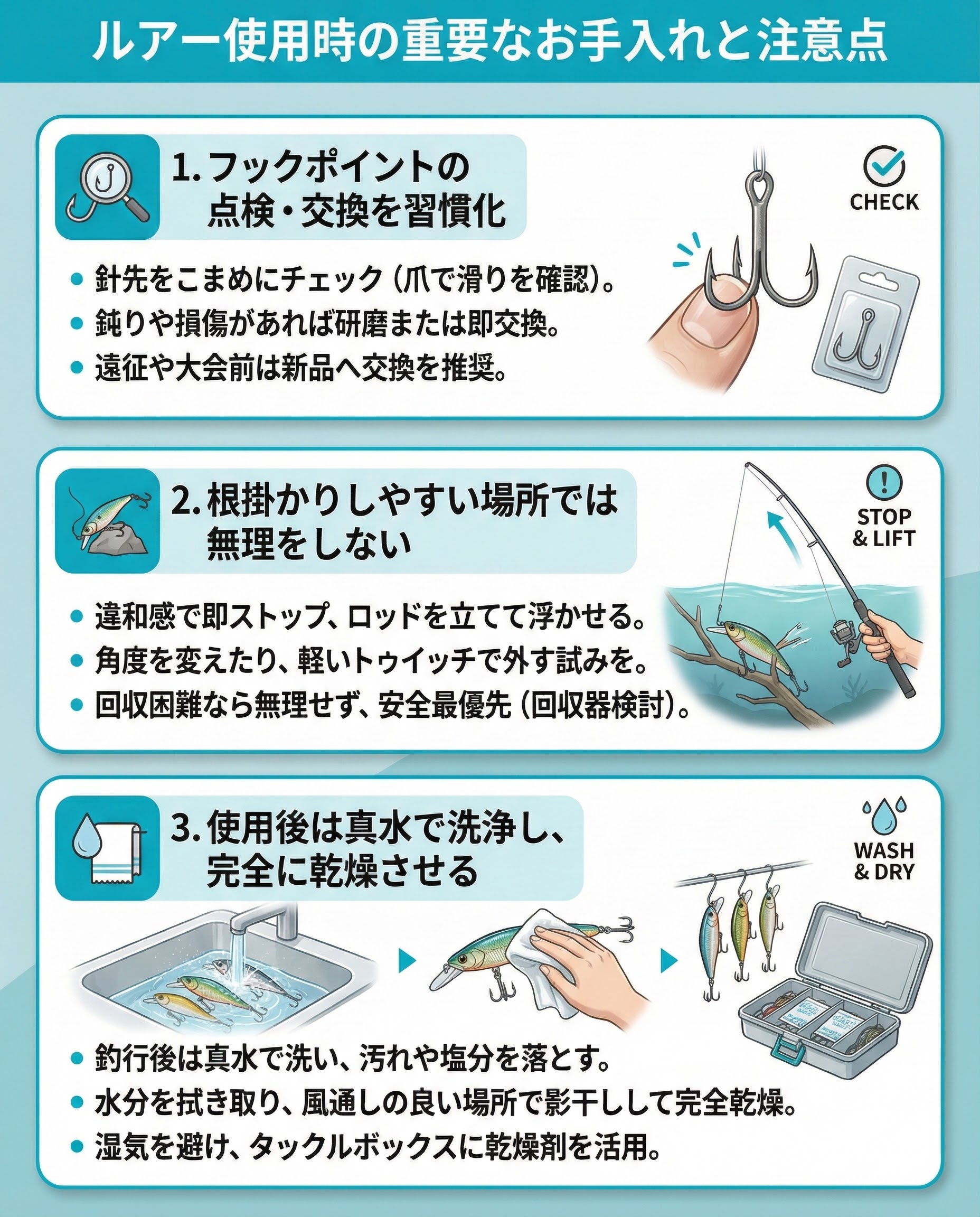 淡水でもミネラルや汚れで劣化します。釣行後は真水で軽くすすぎ、ウエスで水分をオフ。アイやスプリットリングの隙間もチェック。影干しで完全乾燥させ、タックルボックスは湿気を避けて乾燥剤を併用すると長持ちします。
