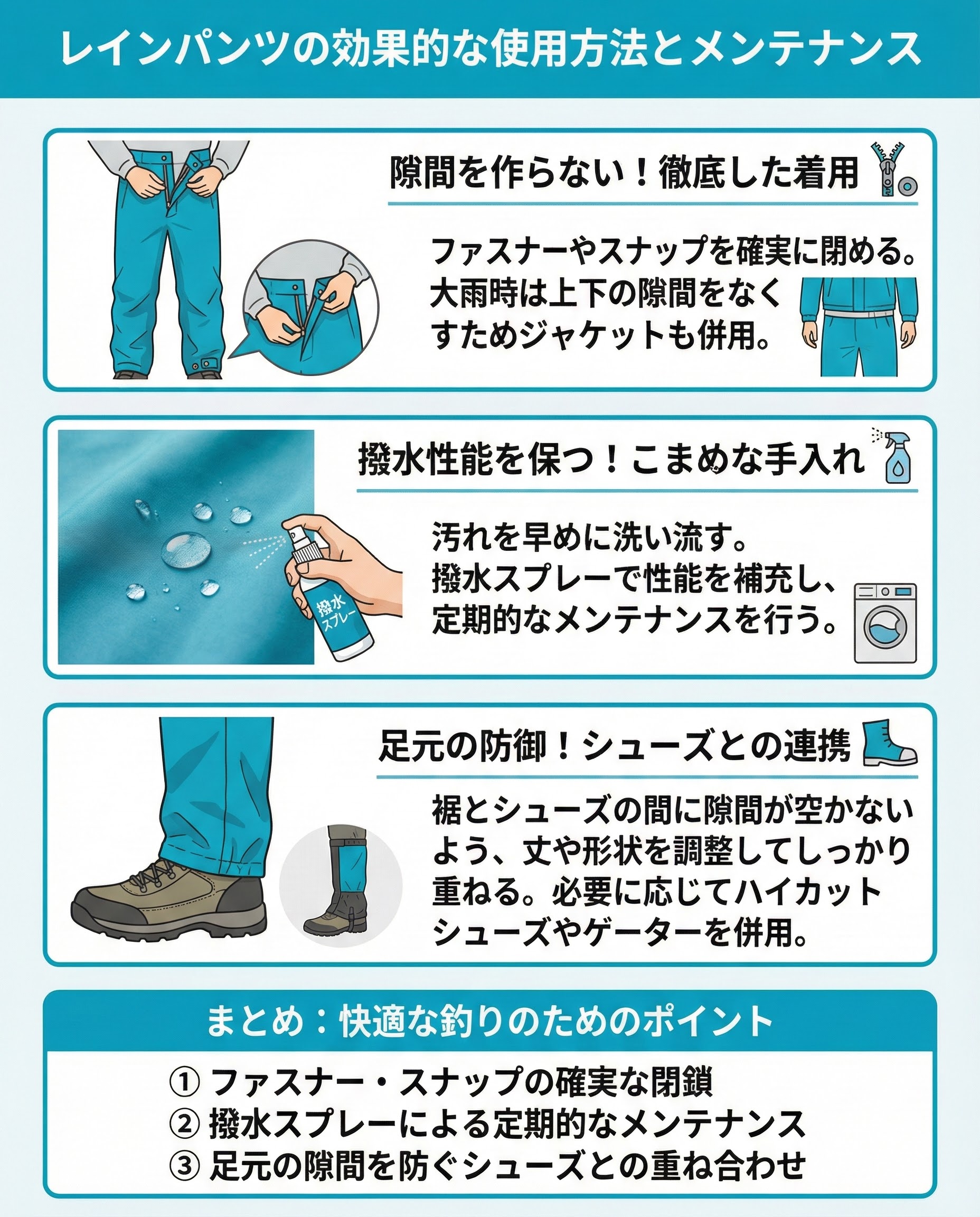 レインパンツは使っているうちに汚れが蓄積し、撥水性が弱まってしまいます。特に裾やヒザ周りなど擦れる部分は汚れが落ちにくいため、帰宅後は早めに洗い流しましょう。撥水スプレーを適宜補充してやると、水玉をしっかり弾く状態が長く続きます。防水性を最大限キープすれば急な雨でも安心して釣りに集中できるので、定期的なメンテナンスを行うことが大切です。