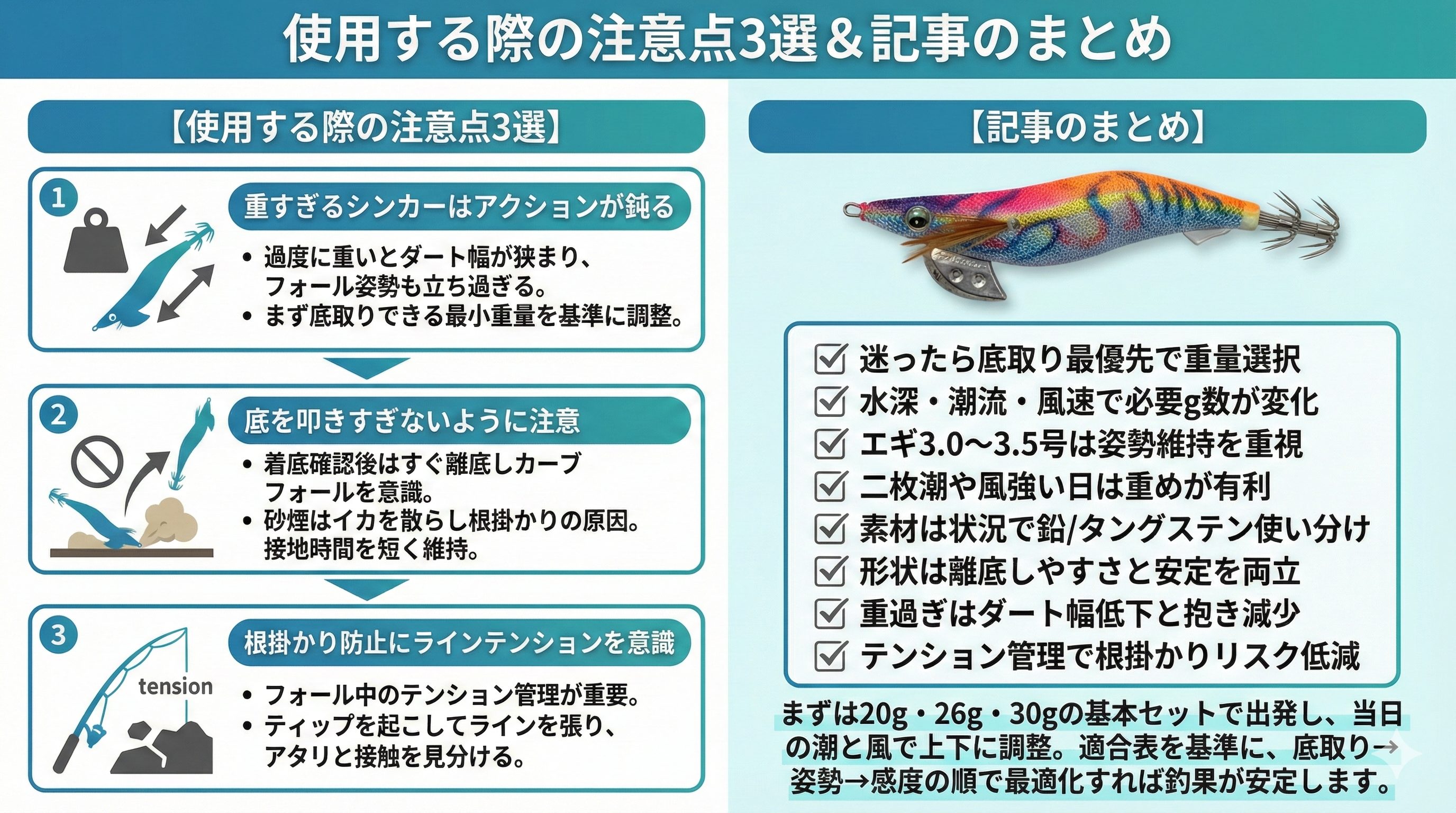まずは20g・26g・30gの基本セットで出発し、当日の潮と風で上下に調整。適合表を基準に、底取り→姿勢→感度の順で最適化すれば釣果が安定します。