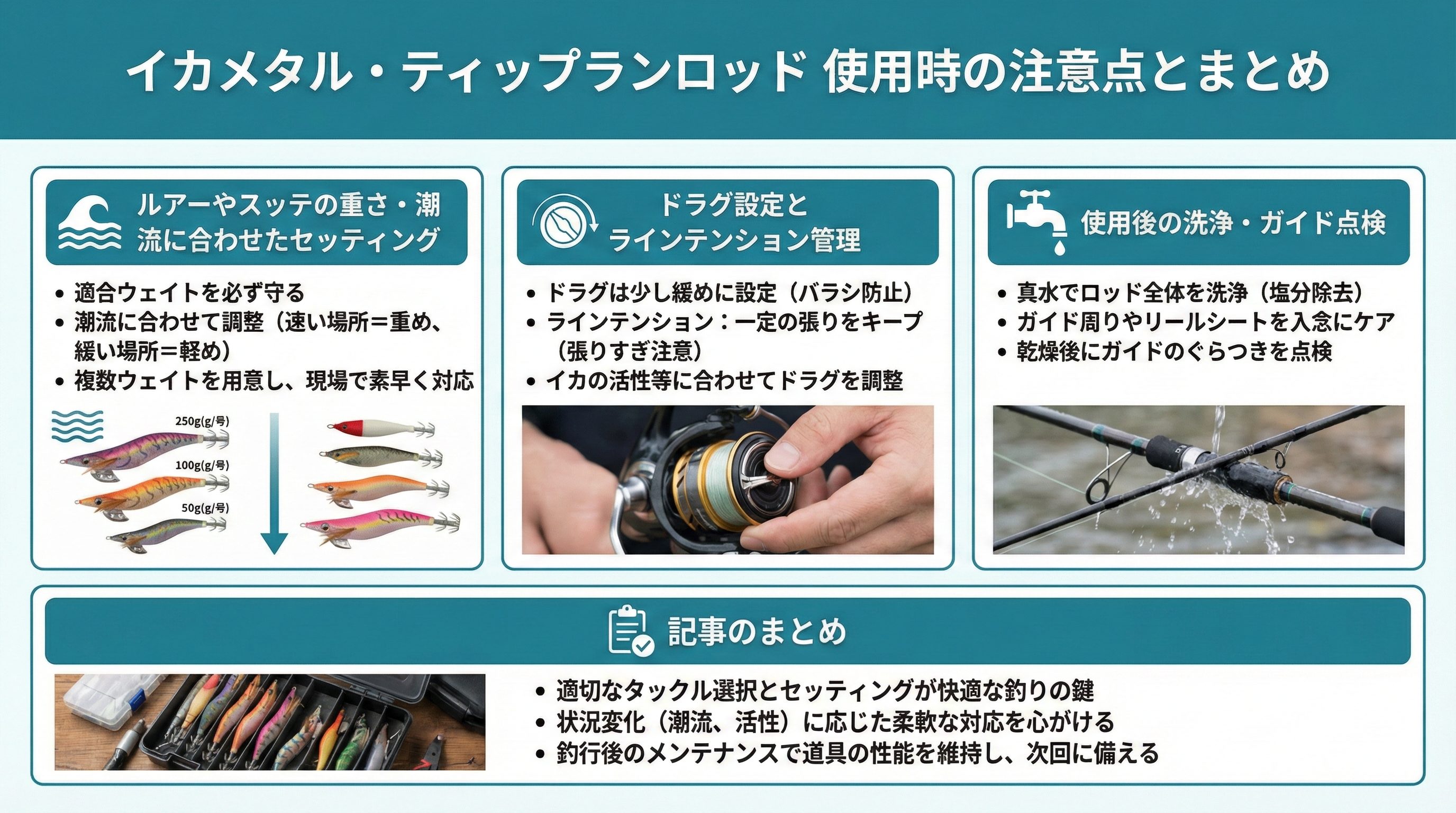 ルアーやスッテの重さ・潮流に合わせたセッティング ドラグ設定とラインテンション管理 使用後の洗浄・ガイド点検 記事のまとめ